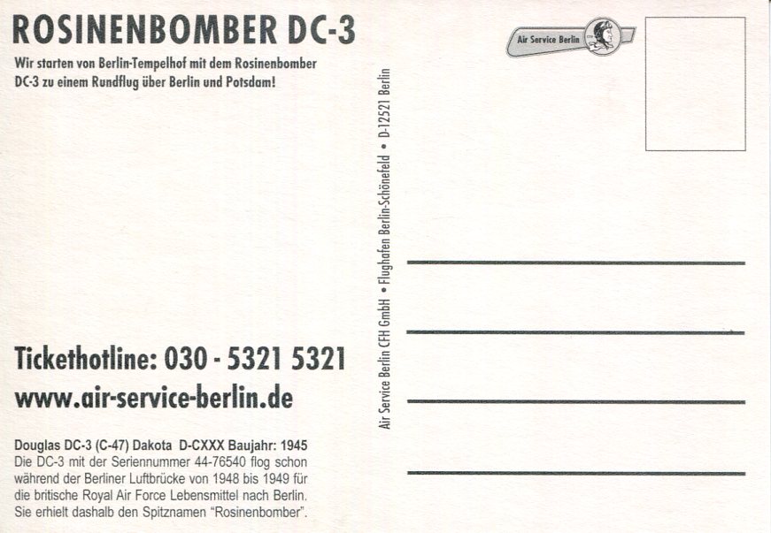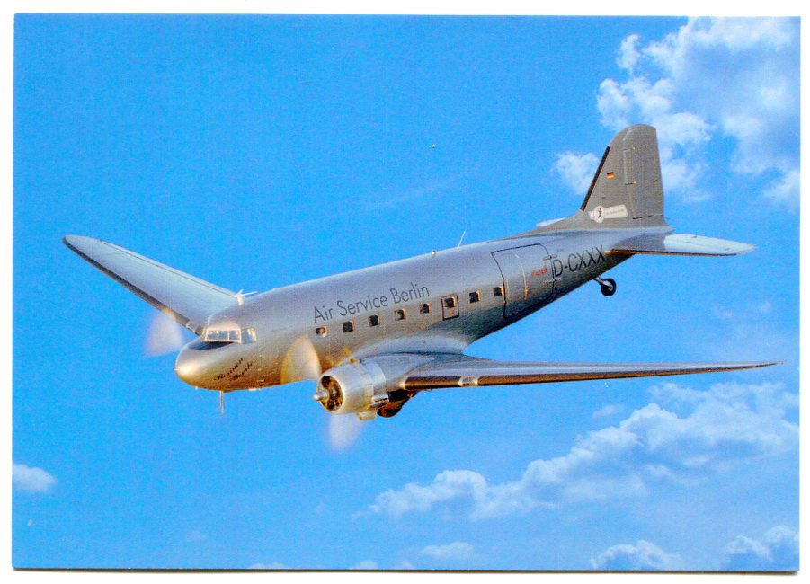 AIR1. | Air Service Berlin , A Great shot of a Air Service Berlin DC-3(D-CXXX) in flight. Card is continental size, C.?? THERE IS CONFLICTING INFORMATION ON THIS DC-3 ON IT'S STATUS; ALTHOUGH IT WAS DELIVERED TO AIR SERVICE BERLIN IN SEPT. 2003. I SUGGEST ANYONE INTERESTED SHOULD DO A GOOGLE AS I DID, unused Back | EX $5.00 |