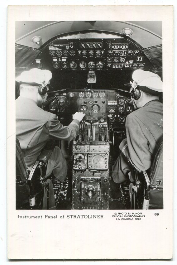 AIR10. | B-307 Stratoliner , A Scarce and Great view of probable Pan American pilots in cockpit of a B-307 Stratoliner. RPPC is standard size, C.1940. The reason I said Pan American pilots is DO TO WHAT I SEE AS "WHITE HATS". NINE B-307's BUILT: 3 FOR PAA, 5 FOR TWA AND 1 TO HOWARD HUGHES, unused Back | EX $20.00 |