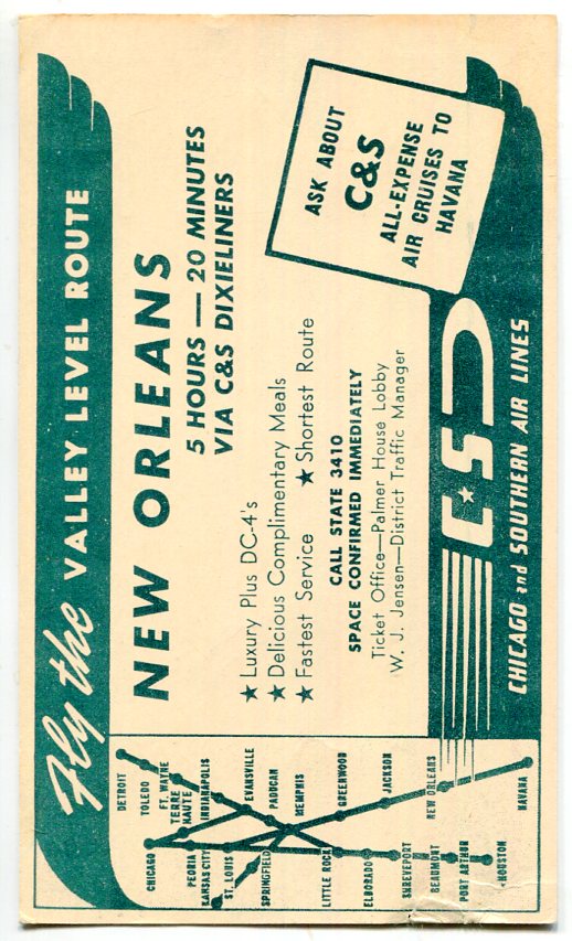 AIR12. | C&S , A Uncommon Chicago and Southern Air Lines "NEW ORLEANS" by "Luxury Plus DC-4's". Card is standard size and dated Jan. 13, 1948. Has a wear spot on the bottom left border near "BEAUMONT" in the Route map, used Back | VG $8.00 |