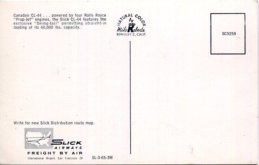 AIR14. | Slick , A Great shot of a Slick Airways Canadair CL-44 at probably San Francisco Int'l airport. Card is standard size. In 1958 Slick Airways started CL-44 operations, unused Back | EX $20.00 |