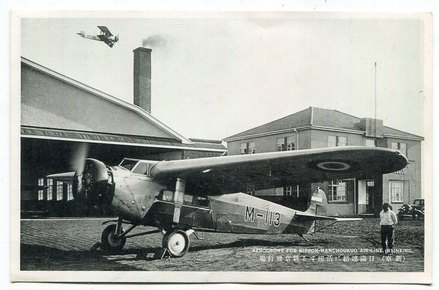 | AIR19. | Nippon Manchoukuo , A RARE Nippon Manchoukuo airline Fokker Model 8 Super Universal on tarmac at Hsinking airport, Nortern China. Card is standard size, C-1933, unused Back | EX $28.00 |