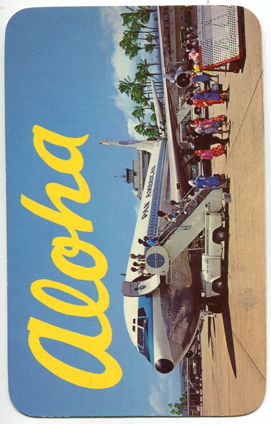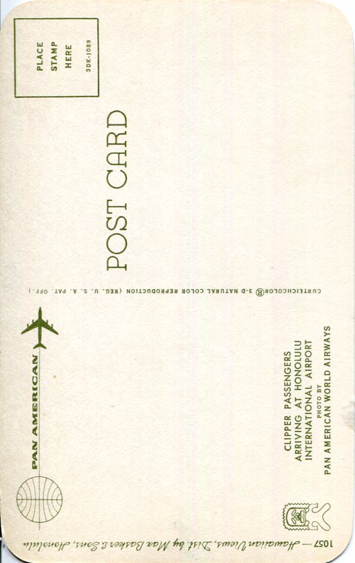 | AIR5. | PAA , A Great view of a Pan American B-707 unloading passenagers at Honolulu Int'l airport, C.60s. Card is standard size, unused Back | EX $10.00 |