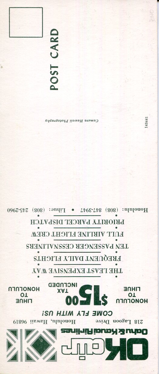 AIR6. | OK Air , A Scarce OKAIR, Oahu & Kauair Airlines, C.1975/1980. Card measures 8 1/4" x 3 1/2", with very light surface wear and a tiny up. lft. cor. tip crease. I think it's Airline issued, unused Back , OK AIR Information | VG+ $17.00 |