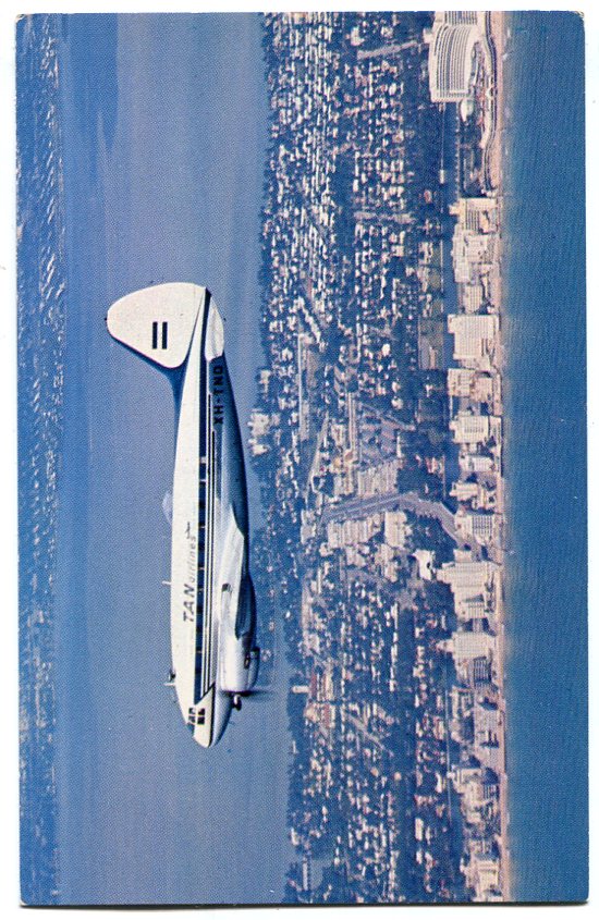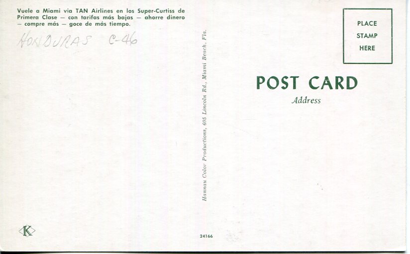 AIR7. | TAN , A Scarce TAN Super Curtiss C-46 in flight over Miami Beach, FL. Card is standard size with light cor. wear, unused Back | VG+ $10.00 |