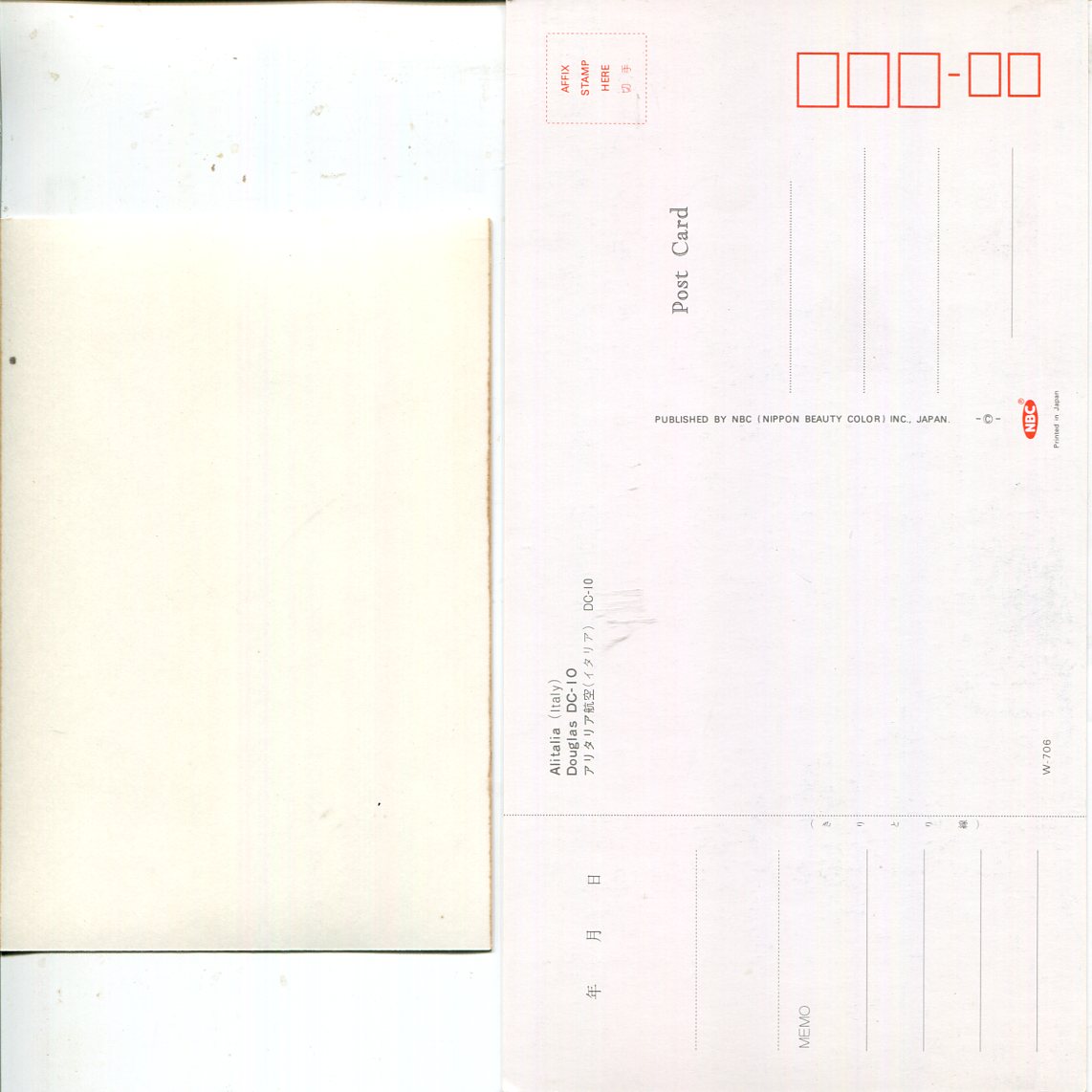 | AIR9. | Alitalia DC-10 & , A Japanese issued Alitalia DC-10 done by NBC, Nippon Beauty Color, Inc., and a Alitalia Color DC-10 photograph. Card measures 7 5/8" x 4"; the photograph 5 1/8" x 3 1/2" and is NOT a Current reproduction, unused Backs | EX $9.00 |