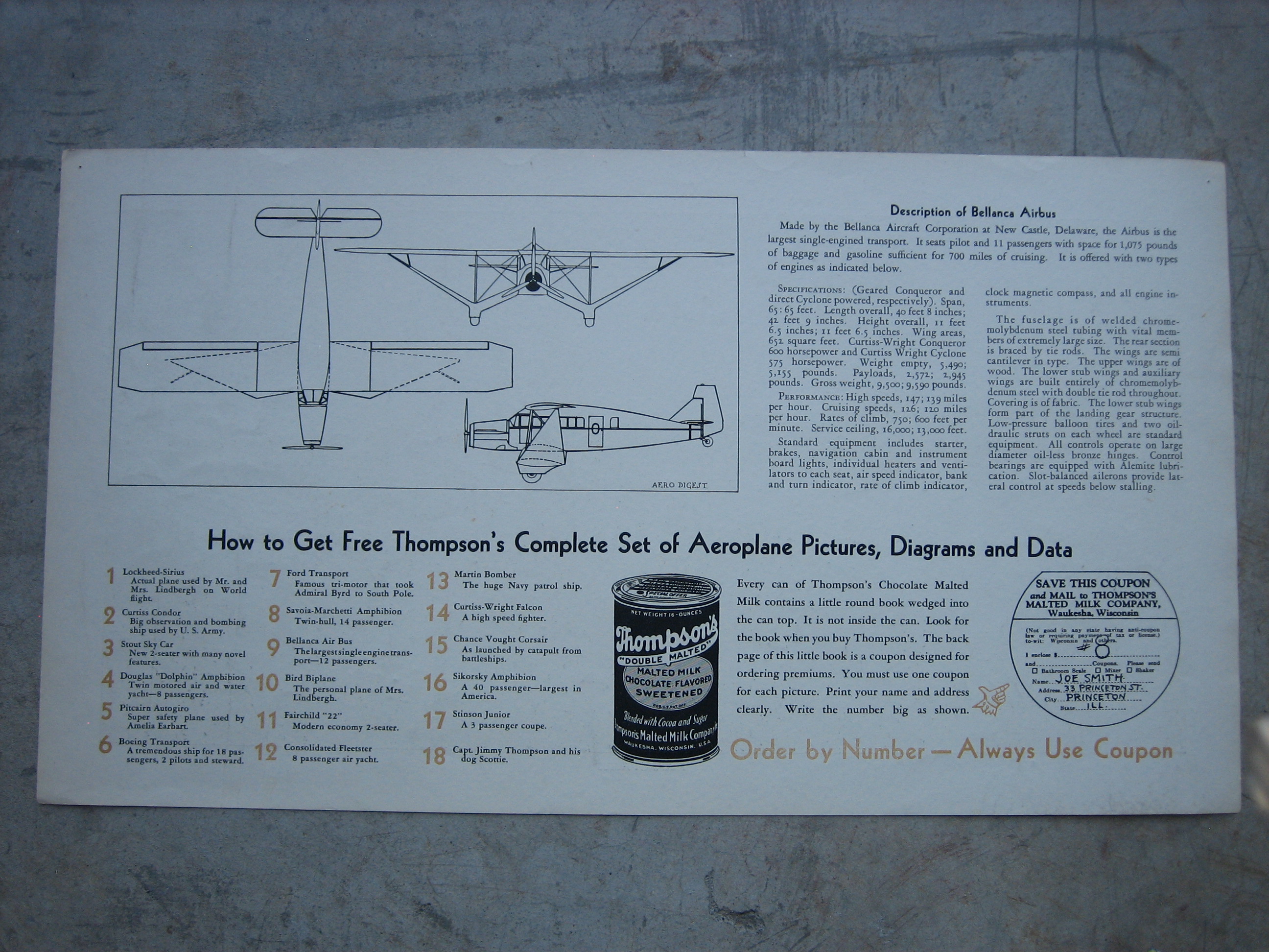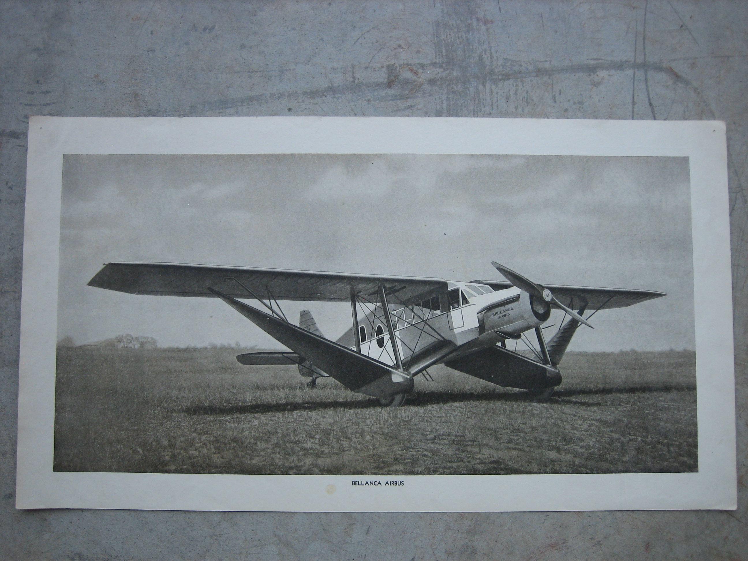 | MSC1. | Bellanca Airbus , A Very Scarce, and Original Bellanca Airbus 1930's print that was distributed by Borden Company's "Thompson's Malted Milk". Print measures 19" x 10 1/2"; with two tiny pin holes in up. lft. & rt. corners. The collection consists of 15 Aviation Prints. The first Bellanca Aircruiser was built in 1930, and WAS ORIGINALLY CALLED THE AIRBUS, THEN designated the P-100. The first Airbus didn't sell due to its water-cooled engine, BUT the P-200-A had a larger and air-cooled engine, and came with floats which operated as a Ferry service in New York City, flying between Wall Street and the East River. ONLY 23 WERE BUILT:BE ADVISED THE PRICE SHOWN INCLUDES A MAILING TUBE AS AN ENVELOPE IS NOT AN OPTION, used Back | VG+ $10.00 |