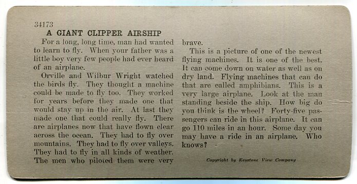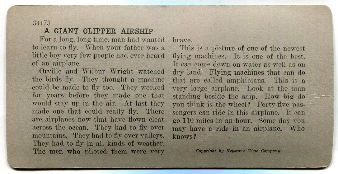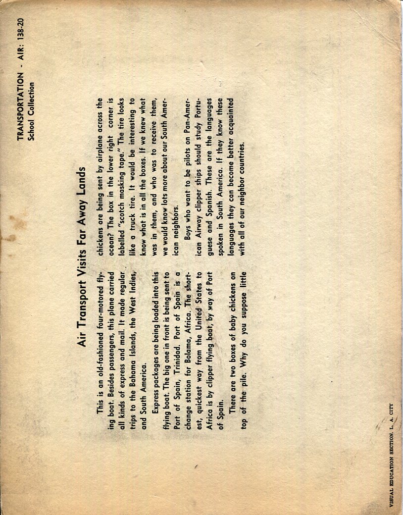 | MSC20. | Pan American , A Scarce "Air Transport First Far Aways Lands" Sikorsky S-40 Amphibian Visual Education Setion of L.A. City. Item measures 11" xc 8 1/2" with corner wear as U can C, unused Back | VG $10.00 |