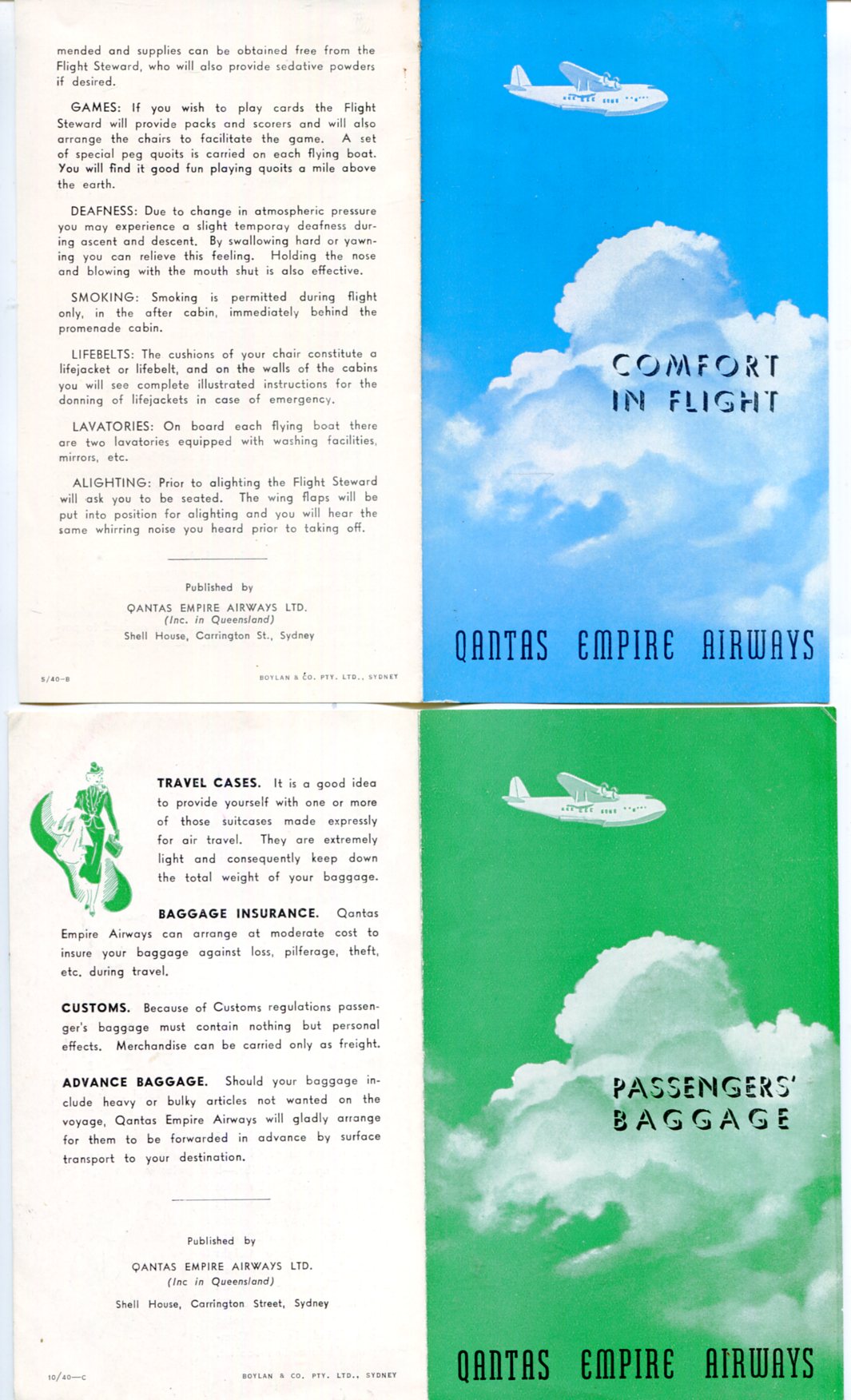 MSC11. | Qantas Empire , A Scarce pair of QEA, Qantas Empire Airways Short Empire C Class Flying boat brochures dated 1940. Each measures 3 3/8" x 6", and two paged. The QEA peacetime operations ran only from July 26,1938 to Sept. 3,39, Sydney to Singapore, but operations at the Australia end continued relatively undisturbed until the Japanese entered the war Dec.7,1941, used Inside of Each | EX $28.00 |