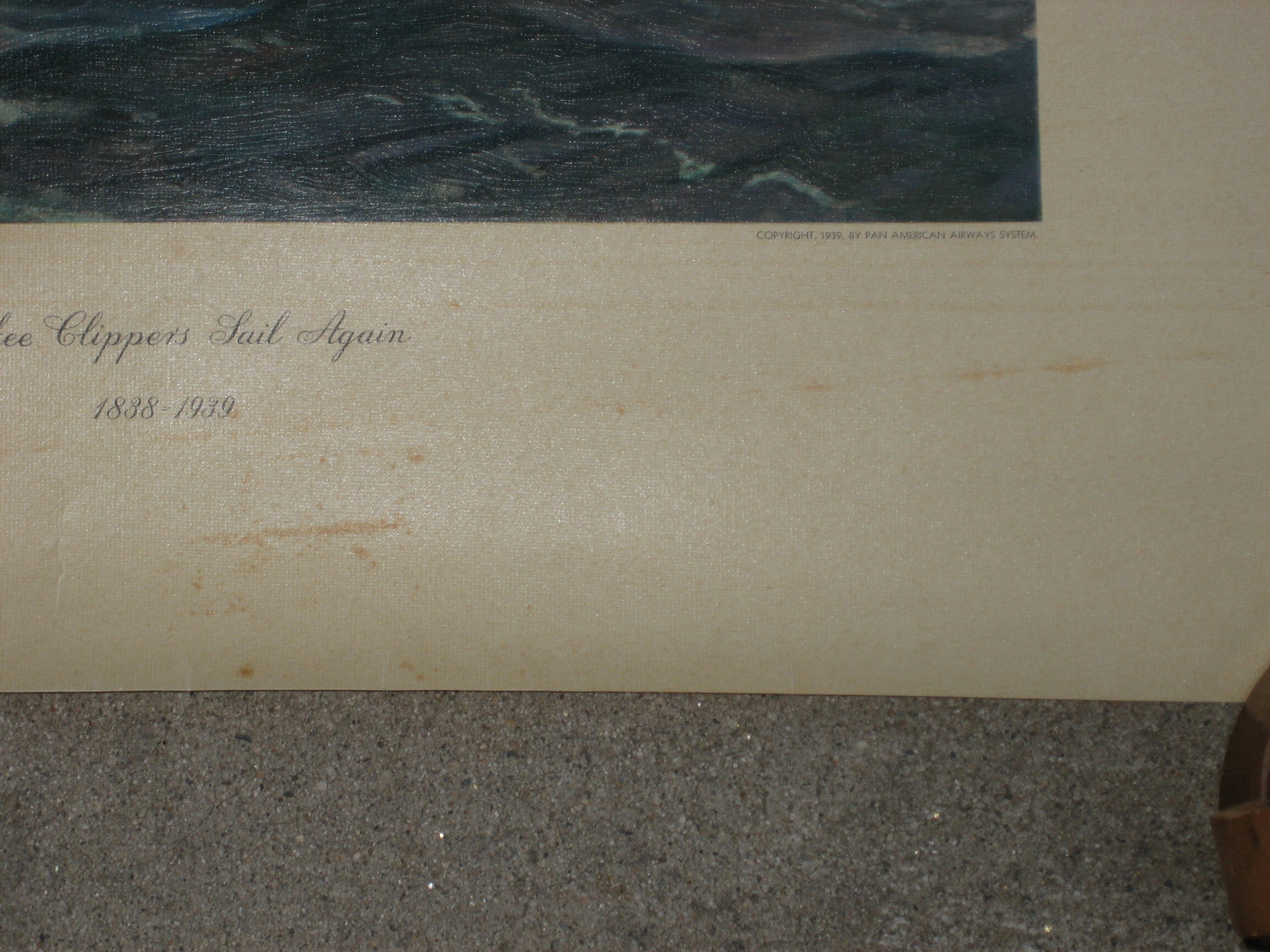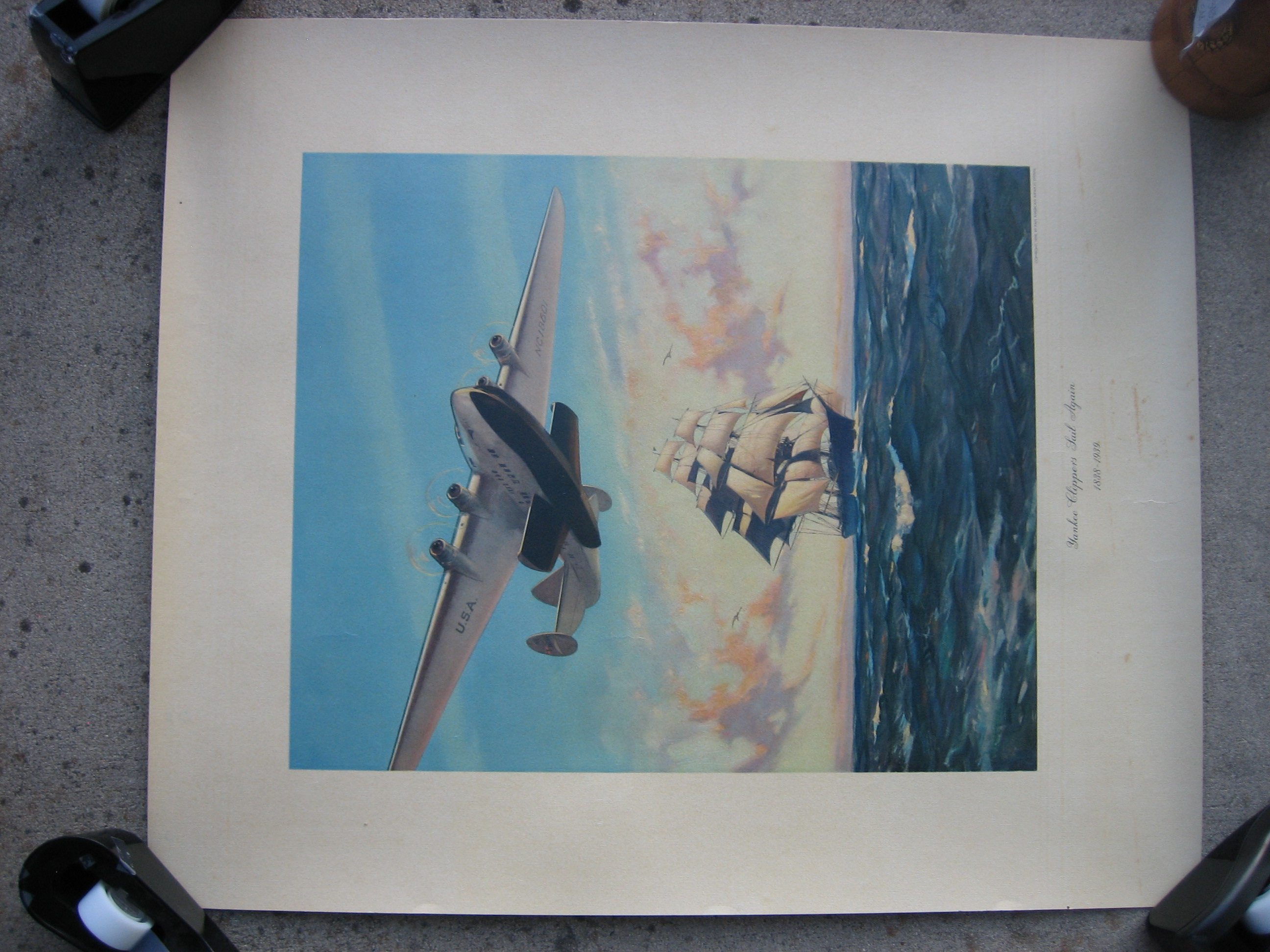 | MSC14. | PAA B-314 POSTER , A Very SCARCE and ORIGINAL Pan American Airways B-314 "CLIPPER SHIPS SAIL AGAIN" Flying boat 1939 poster. Item measures 23 3/4"" x 28", with some wear at the bottom. FREE Mailing Tube is Included, and postage would be between $7.00 to $12.00 depending on the Zip Code, used Lwr. Rt. Cor. Wear , Lwr. Lft. Cor. Wear , Middle Wear | VG+ $225.00 |