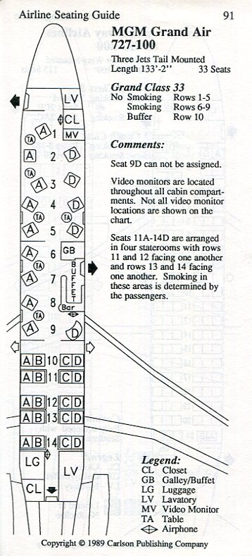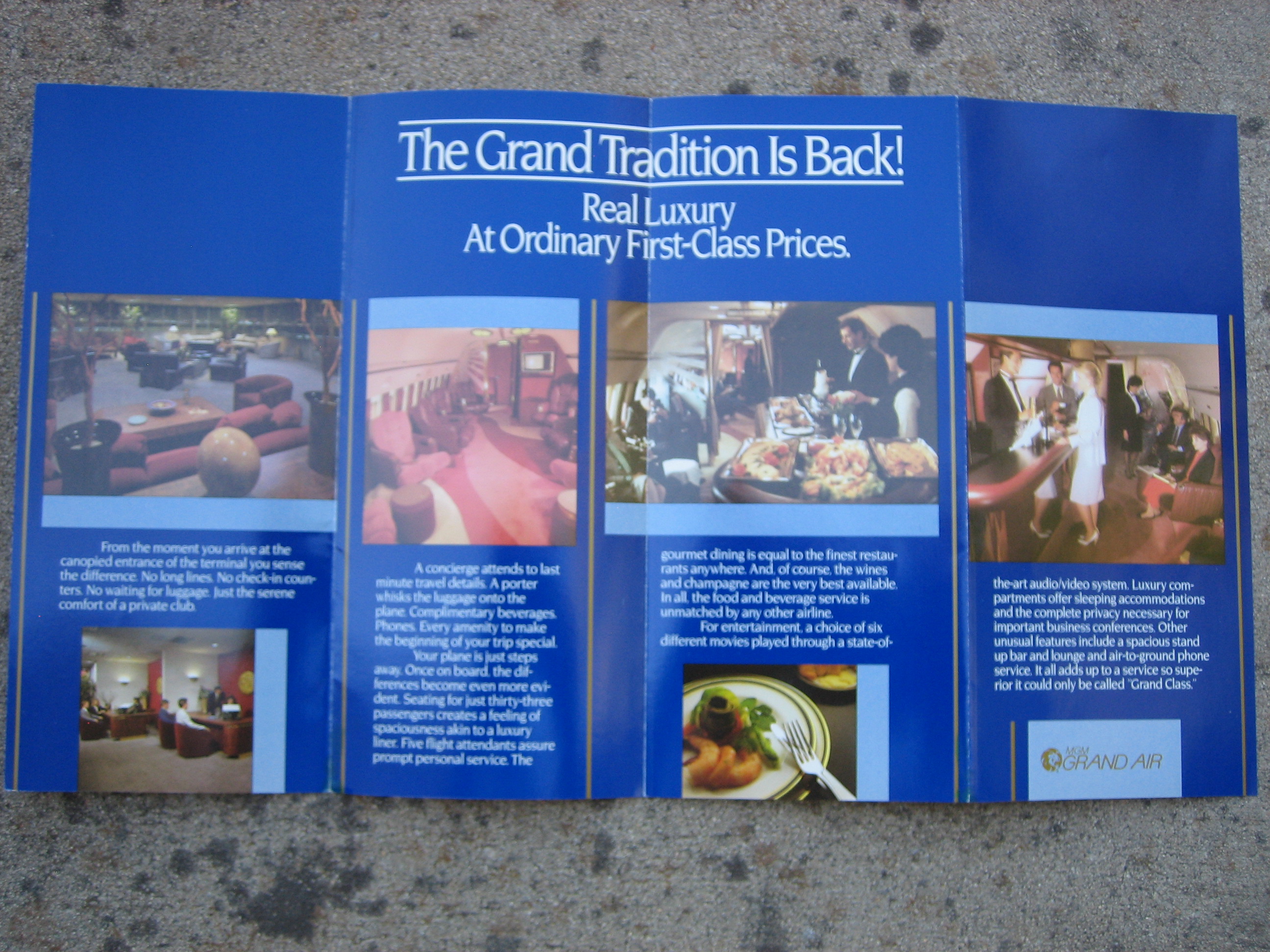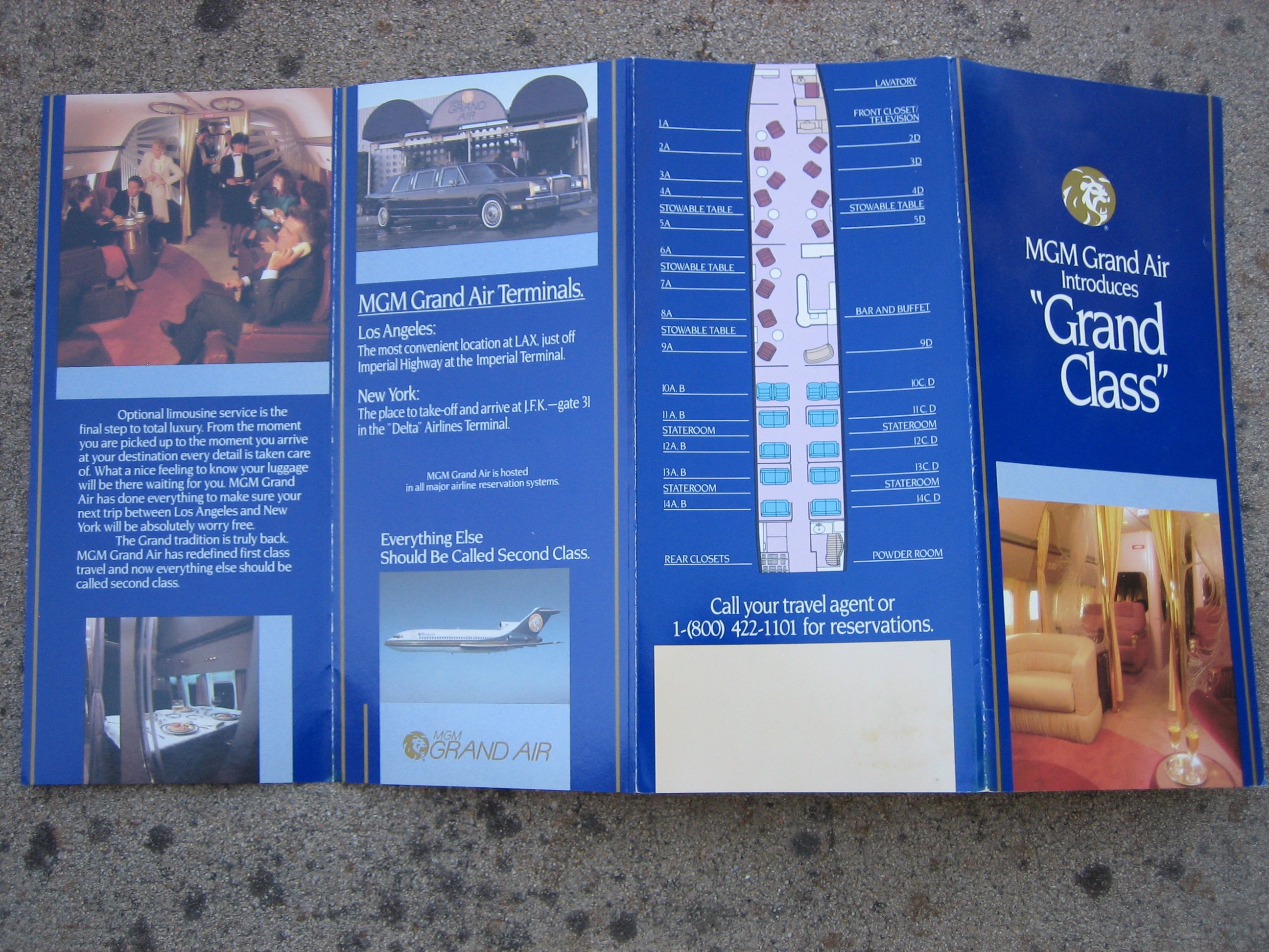 MSC7. | MGM , A Very Scarce MGM Grand Air Introduces "GRAND CLASS" B-727-100 brochure. Item measures 4" x 9", four paneled with light cover wear. HAS A NICE B-727-100 CUT-A-WAY IMAGE. In 1987, MGM Grand Air a scheduled passenger and charter airline owned by MGM Grand, Inc, with a focus on operating VIP charters with luxurious aircraft, was founded and starting operations in September 1987. Operating McDonnell Douglas DC-8-62 and Boeing 727-100, used Inside of Brochure | VG+ $12.00 |