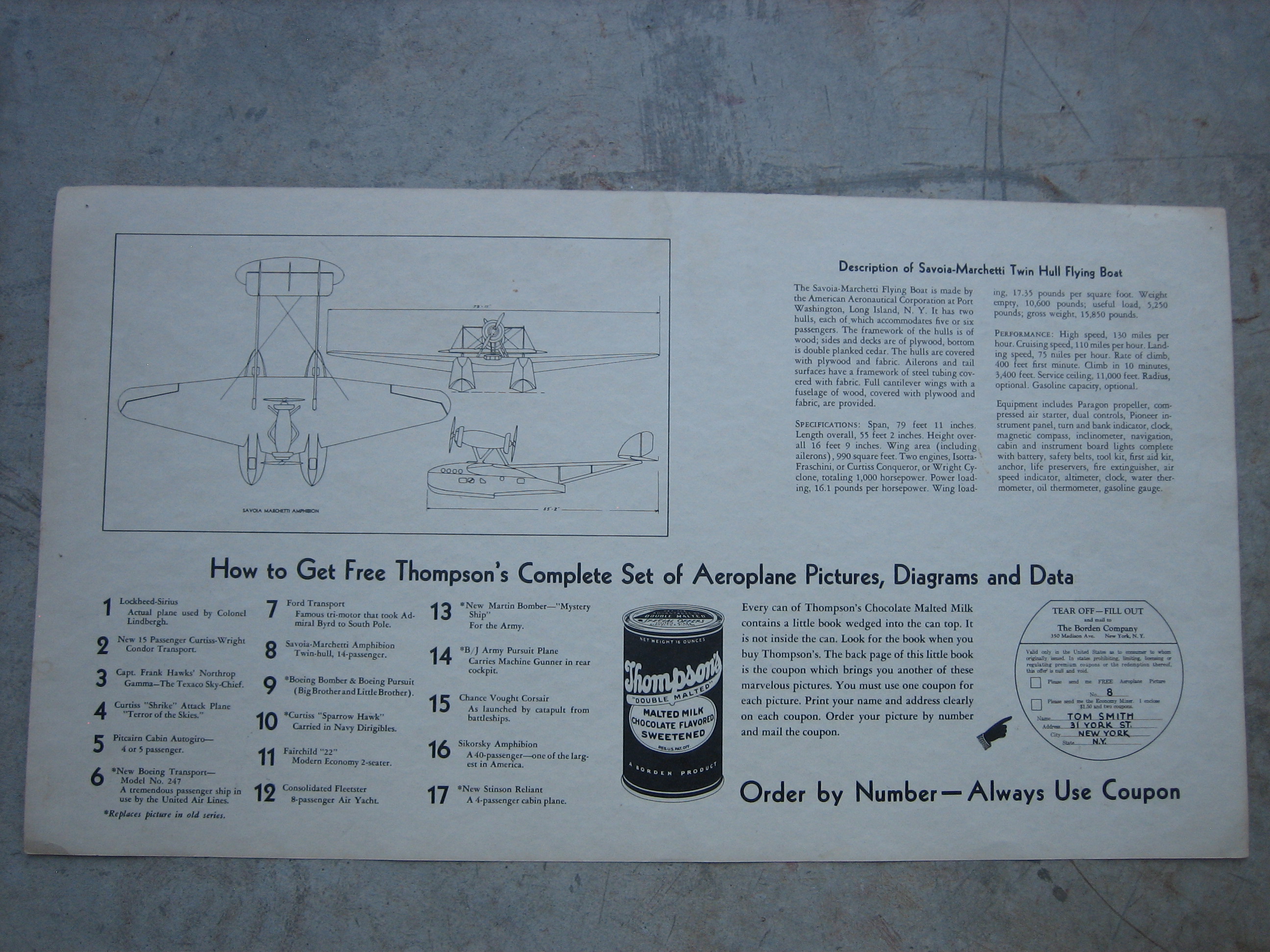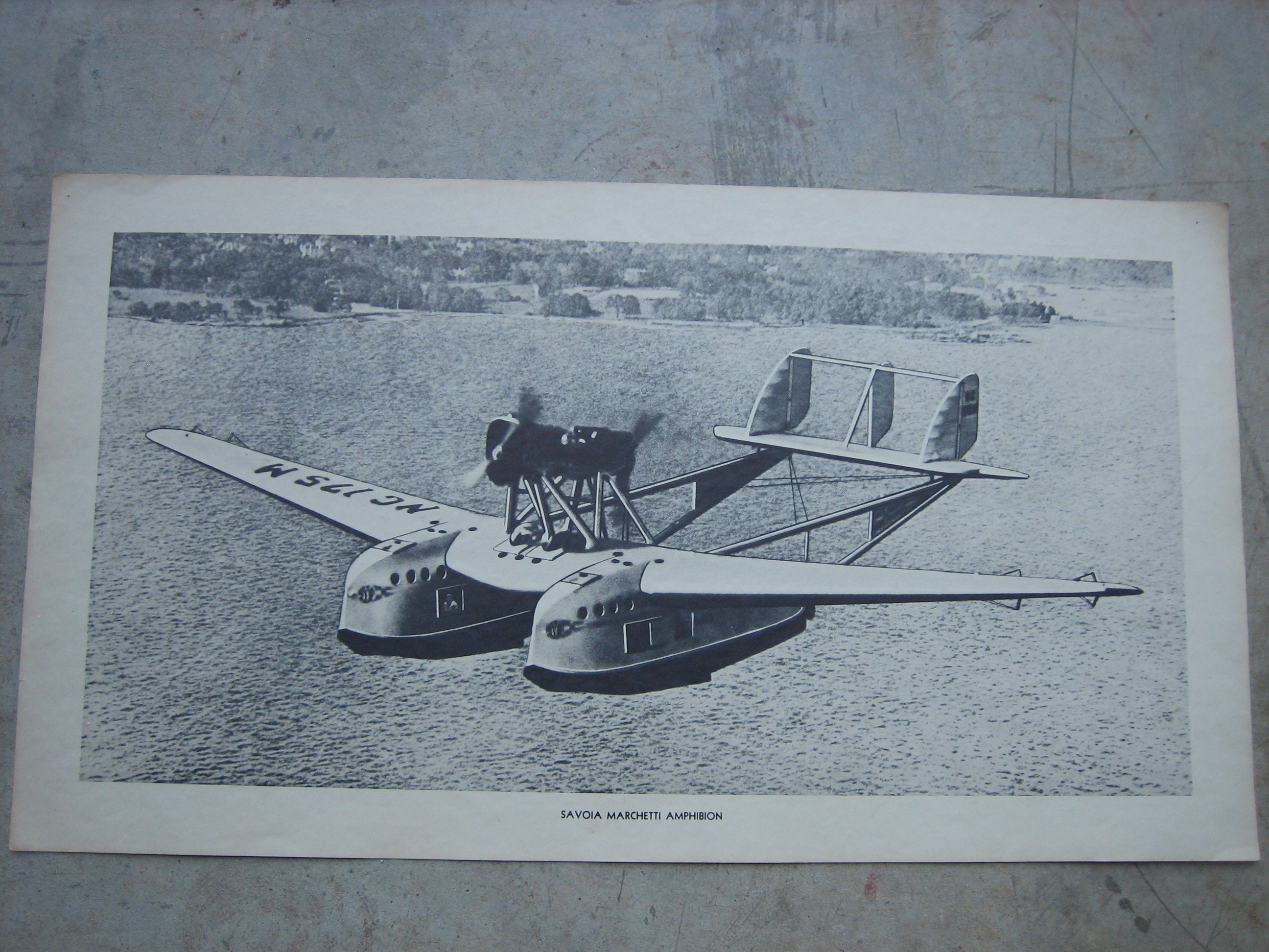 | MSC16. | Savoia Marchetti S-55 , A Very Scarce, and Original Savoia Marchetti Amphibion 1930's print that was distributed by Borden Company's "Thompson's Malted Milk". Print measures 19" x 10 1/2"; with two tiny pin holes in up. lft. and rt. corners. The collection consists of 15 Aviation Prints. The Savoia-Marchetti S.55 series was a double-hulled flying boat produced in Italy beginning in 1924. They started service with Societa Anonima Aero Espress Italiana between Brindisi and Constantinople, Turkey in 1926. Also operated with Societa Aerea Mediterranea(SAM) operating 15, and 10 with Ala Littoria in 1934: BE ADVISED THE PRICE SHOWN INCLUDES A MAILING TUBE AS AN ENVELOPE IS NOT AN OPTION, used Back | VG+ $10.00 |