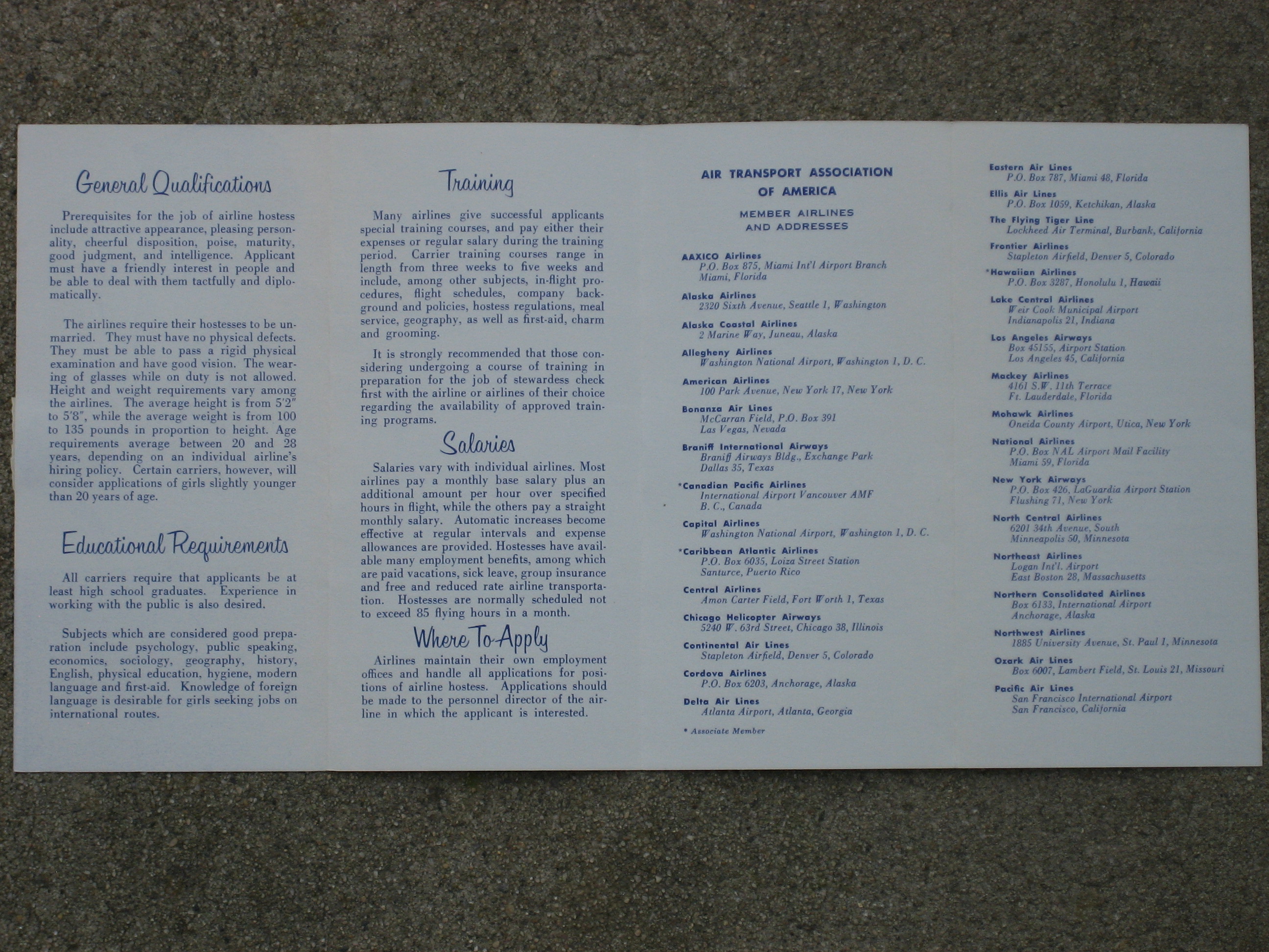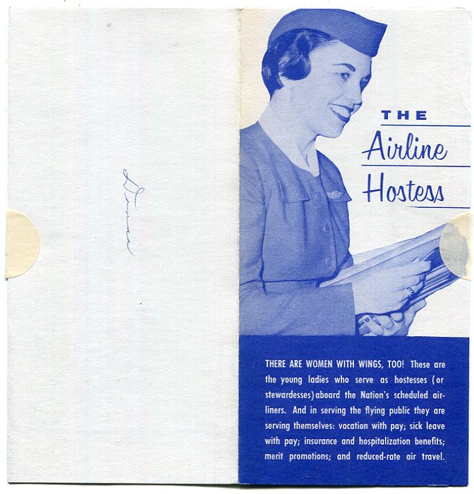 | MSC17. | The Airline Hostess , A Cool covered "The Airline Hostess" brochure, C.'50s. Item measures 3 3/8" x 7 1/8" with four panels, used Information & Listed Airlines , More Airlines | EX $12.00 |