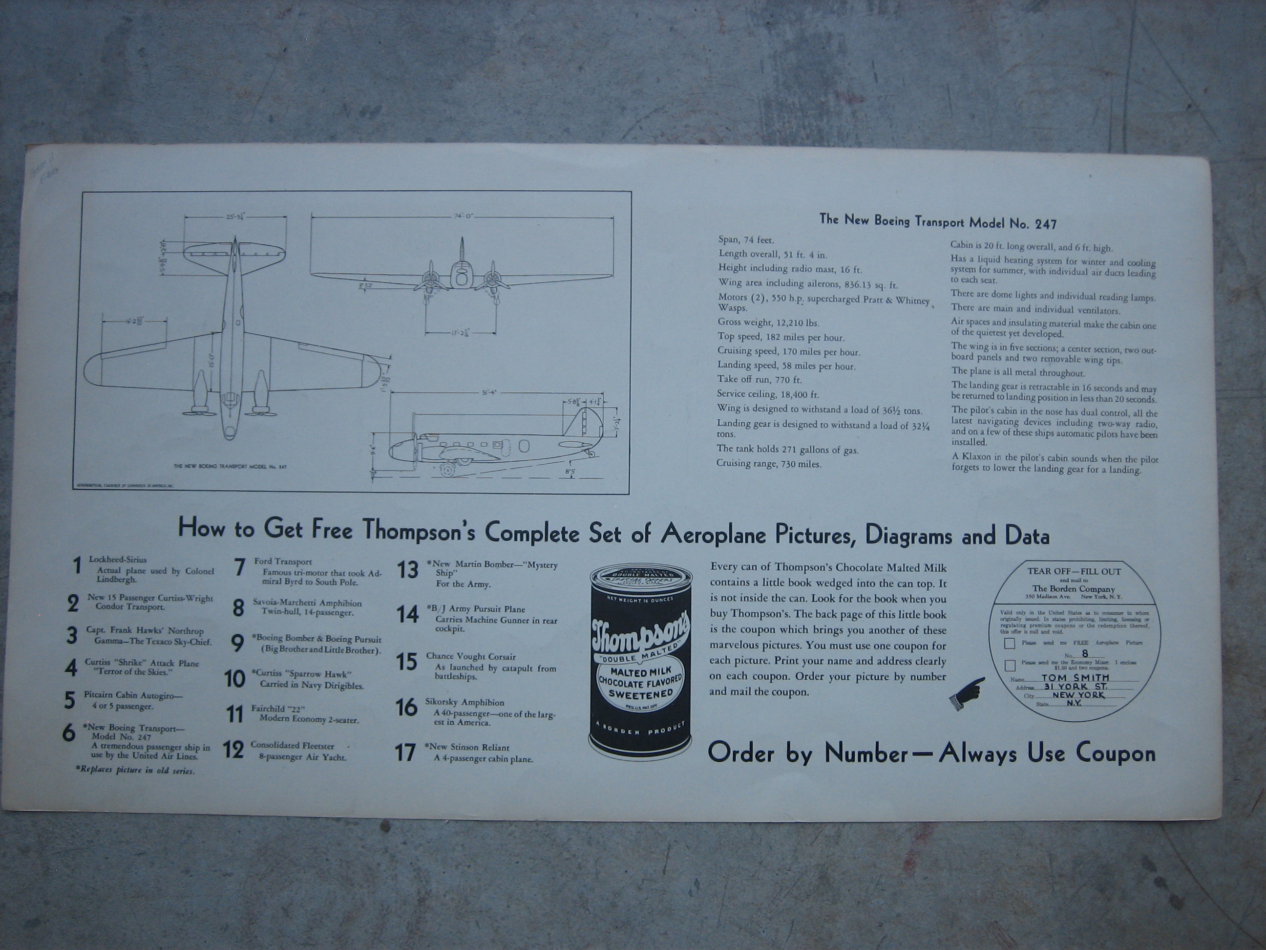 | MSC19. | B-247(NC13301) , A Very Scarce, and Original B-247 Model 1930's print that was distributed by Borden Company's "Thompson's Malted Milk". Print measures 19" x 10 1/2"; with a up. rt. corner crease. It was delivered to Pacific Air Transport in 1933(no month listed) after First flight in February 1933. Then converted/modified to Boeing 247E tested for 247D modifications C.1934 at Boeing Co.; then transferred from the Boeing Company to United AirLines in May 1934. The collection consists of 15 Aviation Prints:BE ADVISED THE PRICE SHOWN INCLUDES A MAILING TUBE AS AN ENVELOPE IS NOT AN OPTION, used Back | VG+ $12.00 |