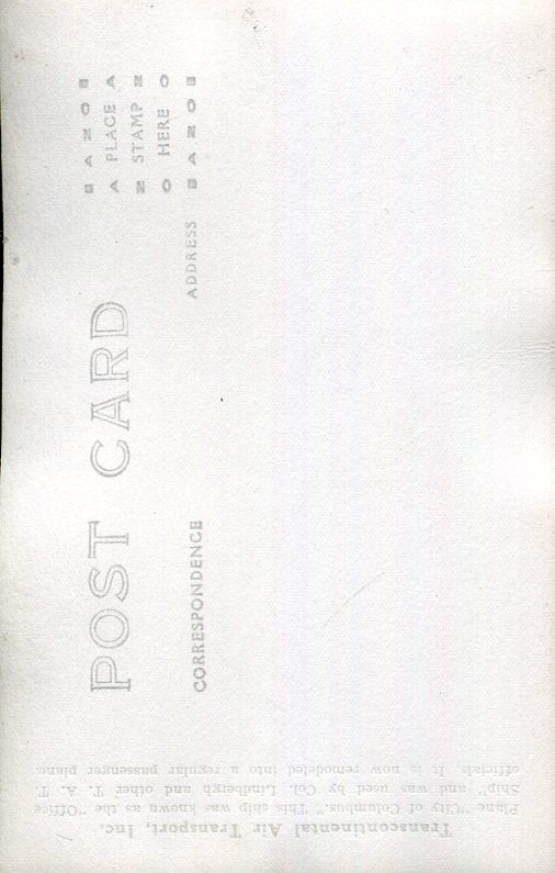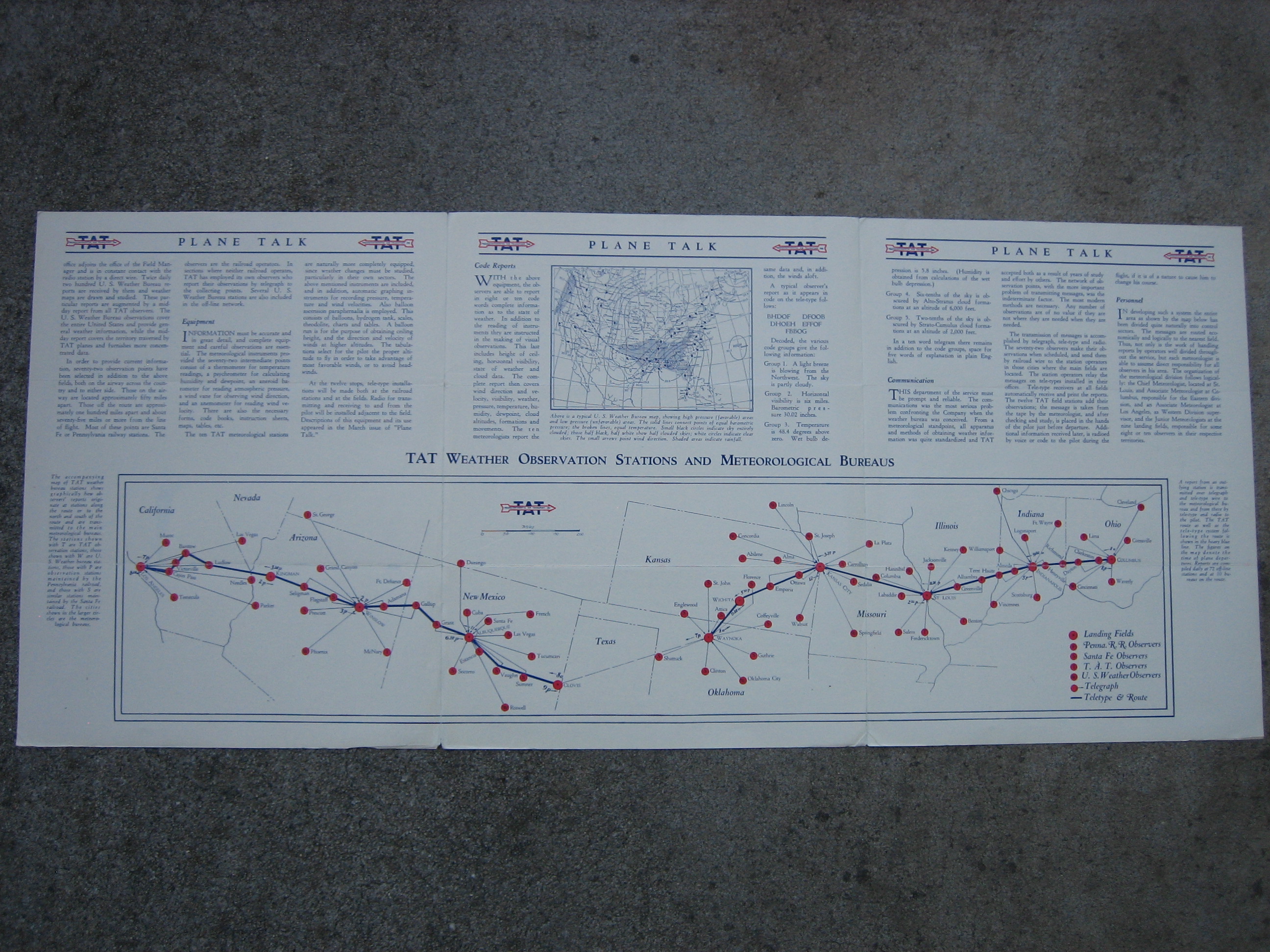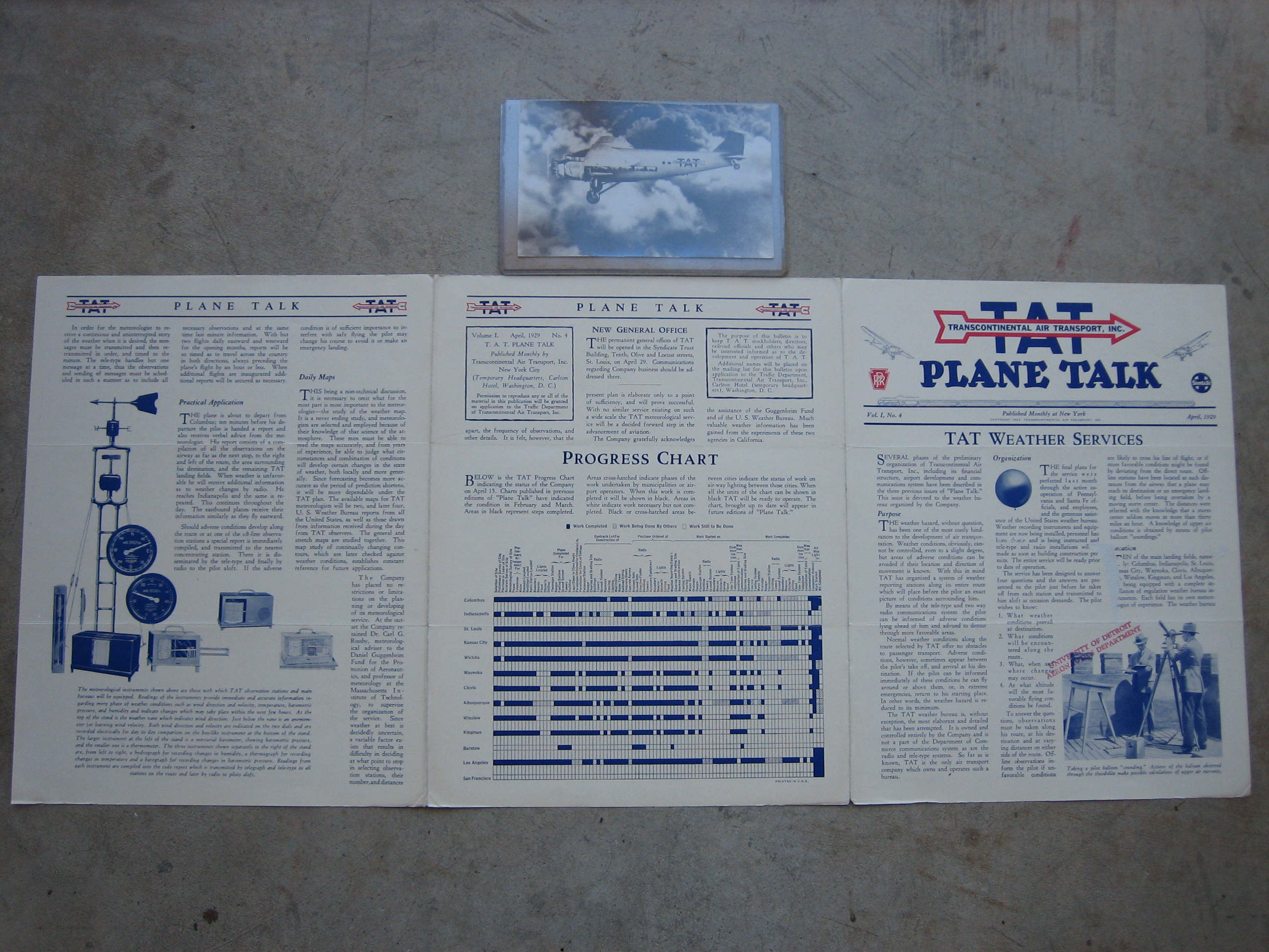 | MSC23. | T.A.T. , An EXTREMELY RARE T.A.T., Transcontinental Air Transport "BULLETIN" brochure dated July 1929, with a Very RARE TAT airline issued post card. The brochure measures 8" x 11", two paged with mini fold tears. Of course it was folded for mailing. The postcard is standard size. As old as the card is, there is some wavering, used Inside of Brochure , Back of the Postcard | VG $65.00 |