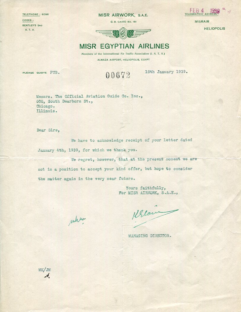 | MSC24. | MISR , A Early, and RARE MISR EGYPTIAN AIRLINES autographed letter dated 18th January 1939. It measures 8 3/4" x 11". Was folded for mailing and has a crease in the lwr. rt. area, used | VG $15.00 |