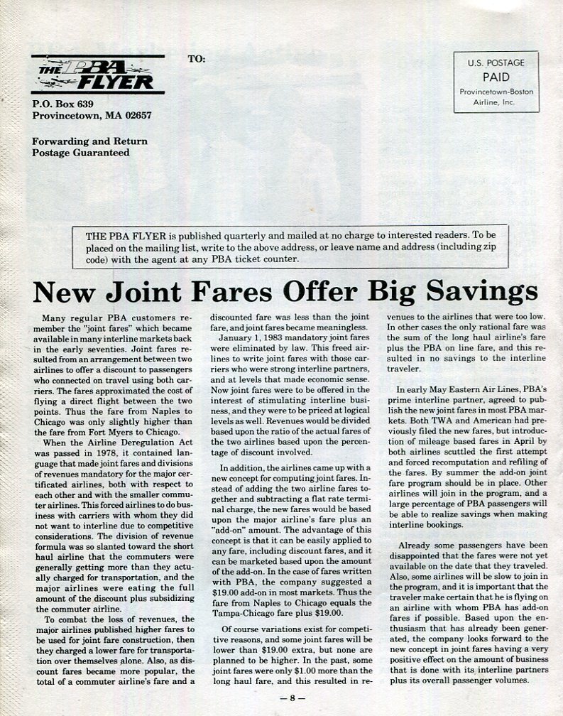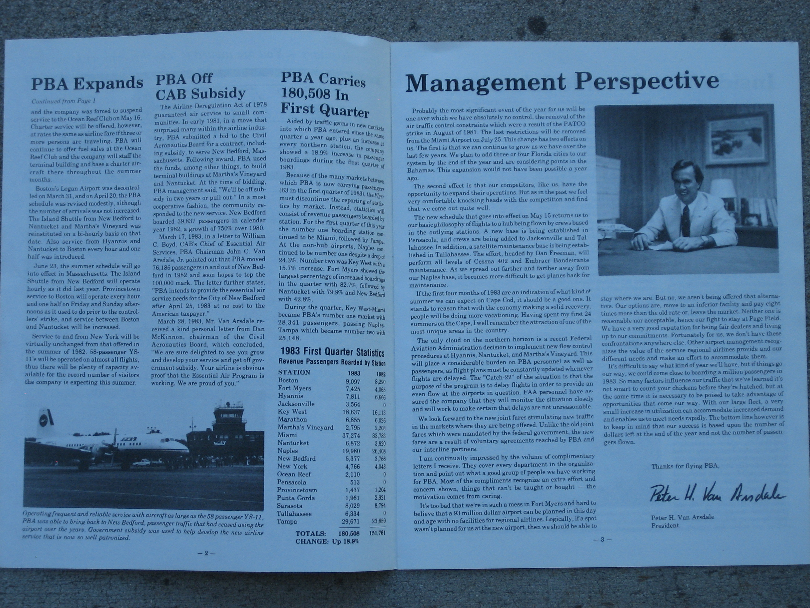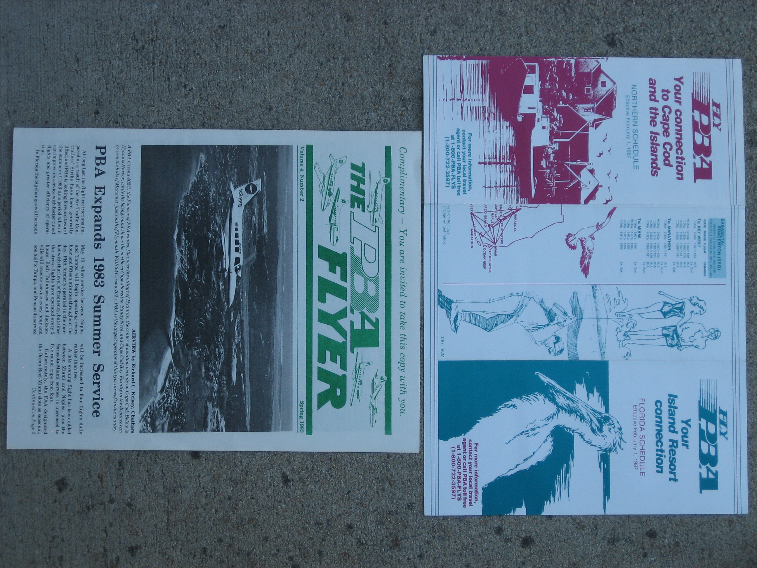 MSC25. | PBA Flyer & PBA Timetable , A Sarace " The PBA FLYER" brochure and a PBA system schedule dated February 1,1987. The brochure is dated Spring 1983, and measures 8 3/8" x 10 5/8" with 8 total pages. TT measures 4" x 8 1/2" with four panels. It's kind of unique in that, one side shows the "NORTHERN SCHEDULE", and the other side shows the "FLORIDA SCHEDULE", used Front Page 1 , Back Cover/Page 8, Pages 2 & 3 , Pages 4 & 5 , Pages 5 & 6 | EX $9.00 |