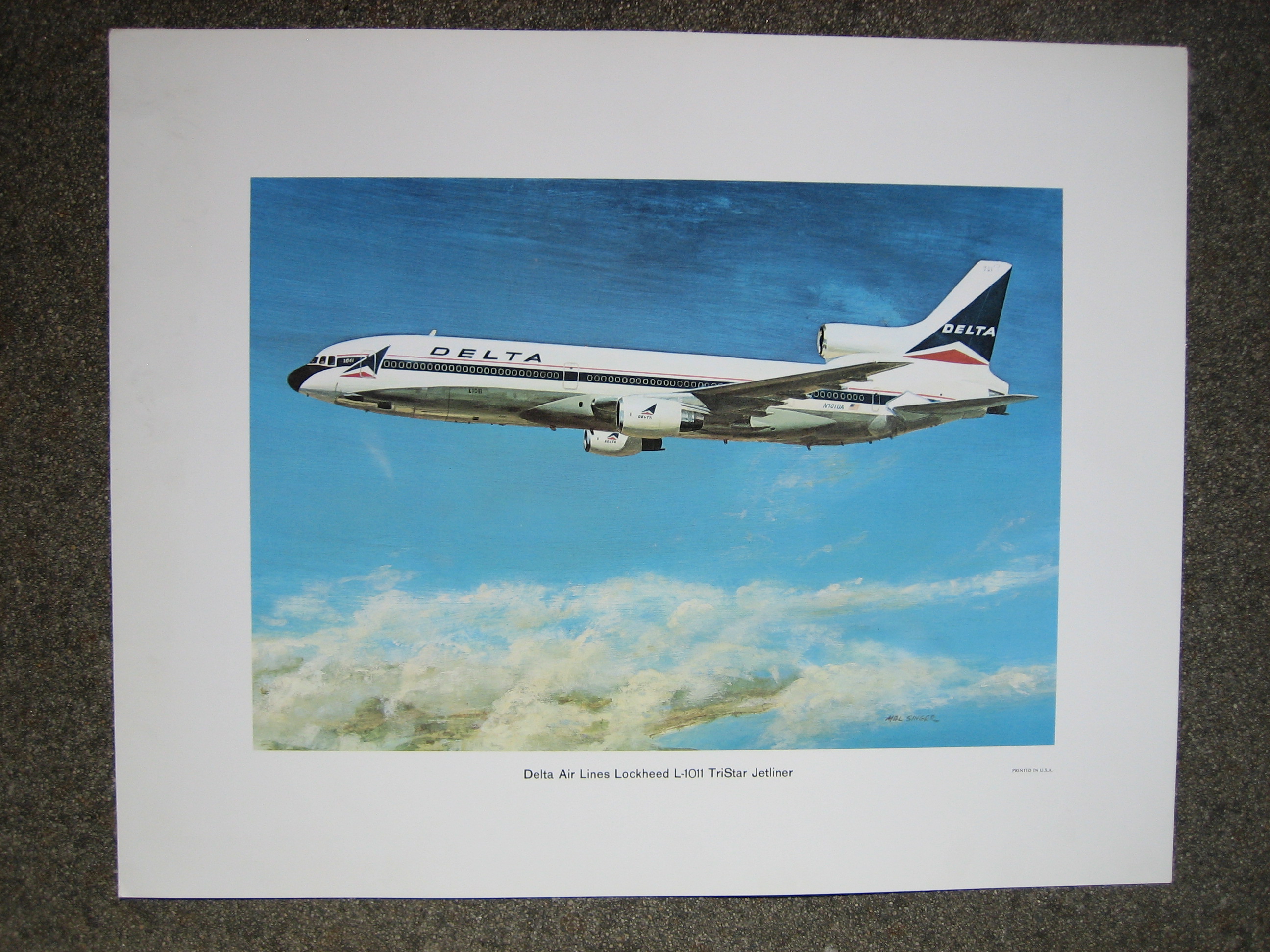 | MSC26. | Delta L-1011 , A Delta Airlines L-1011 Color print/poster, C.1972/1974. Item measures 20" x 16". Delta started L-1011 flights on April 1, 1972. THIS ITEM WILL HAVE TO BE MAILED IN A SMALL TUBE WHICH IS INCLUDED IN THE PRICE SHOWN, used | EX $12.00 |