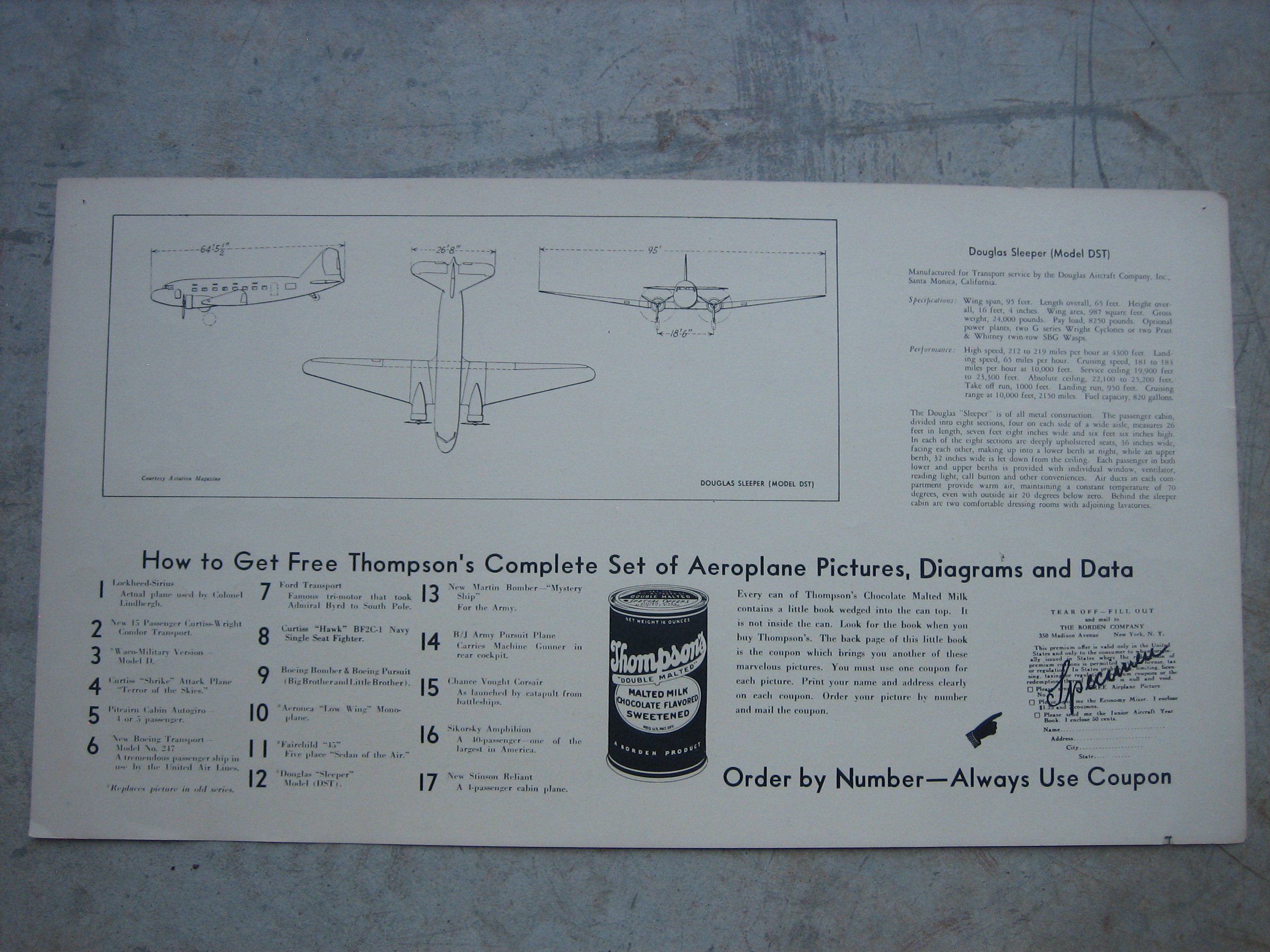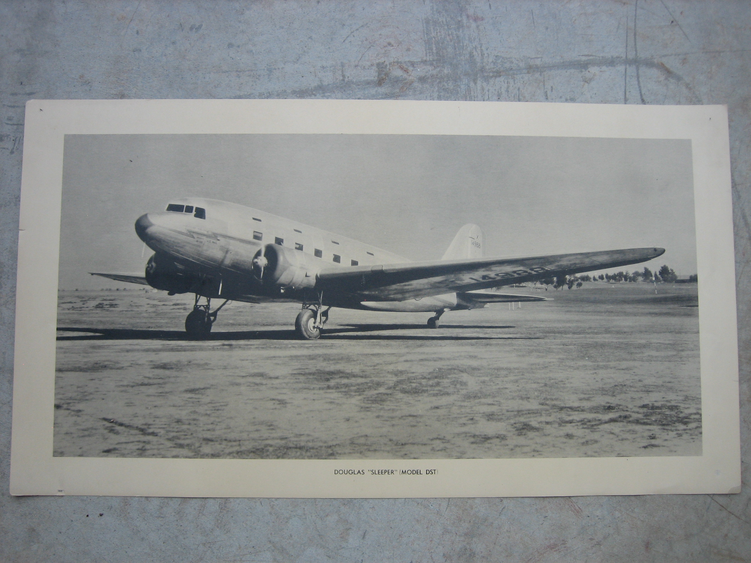 | MSC27. | DC-2-144(DST) , A VERY RARE, and Original PROTOTYPE DC-2-144(DST)X14988 1930's print that was distributed by Borden Company's "Thompson's Malted Milk". Print measures 19" x 10 1/2"; with two tiny pin holes in up. lft. and rt. corners. It was delivered to American Airlines as NC14988 in July 1936 after it's First flight in December 1935; then to TWA in March 1942. The collection consists of 15 Aviation Prints: BE ADVISED THE PRICE SHOWN INCLUDES A MAILING TUBE AS AN ENVELOPE IS NOT AN OPTION, used Back | EX $10.00 |