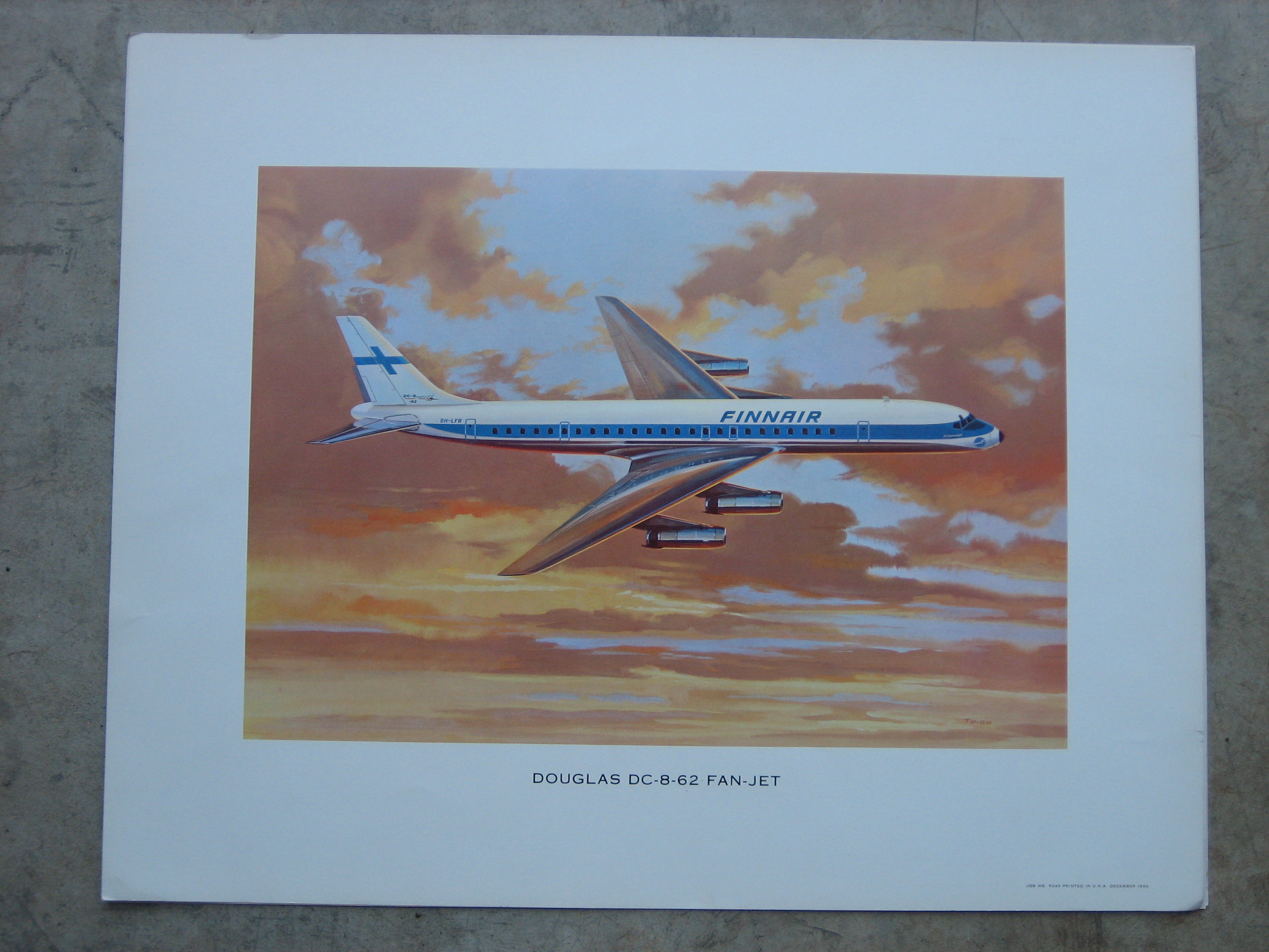 | MSC29. | Finnair , A Cool Finnair DC-8-62 Fanjet Color poster/print dated December 1968. Item measures 20" x 16" with a lwr. rt. cor. tip crease. The Inaugural flight for their DC-8-62 Fan-Jet took place on March 31, 1967. THIS ITEM WILL HAVE TO BE MAILED IN A SMALL TUBE WHICH IS INCLUDED IN THE PRICE SHOWN, used | EX $14.00 |