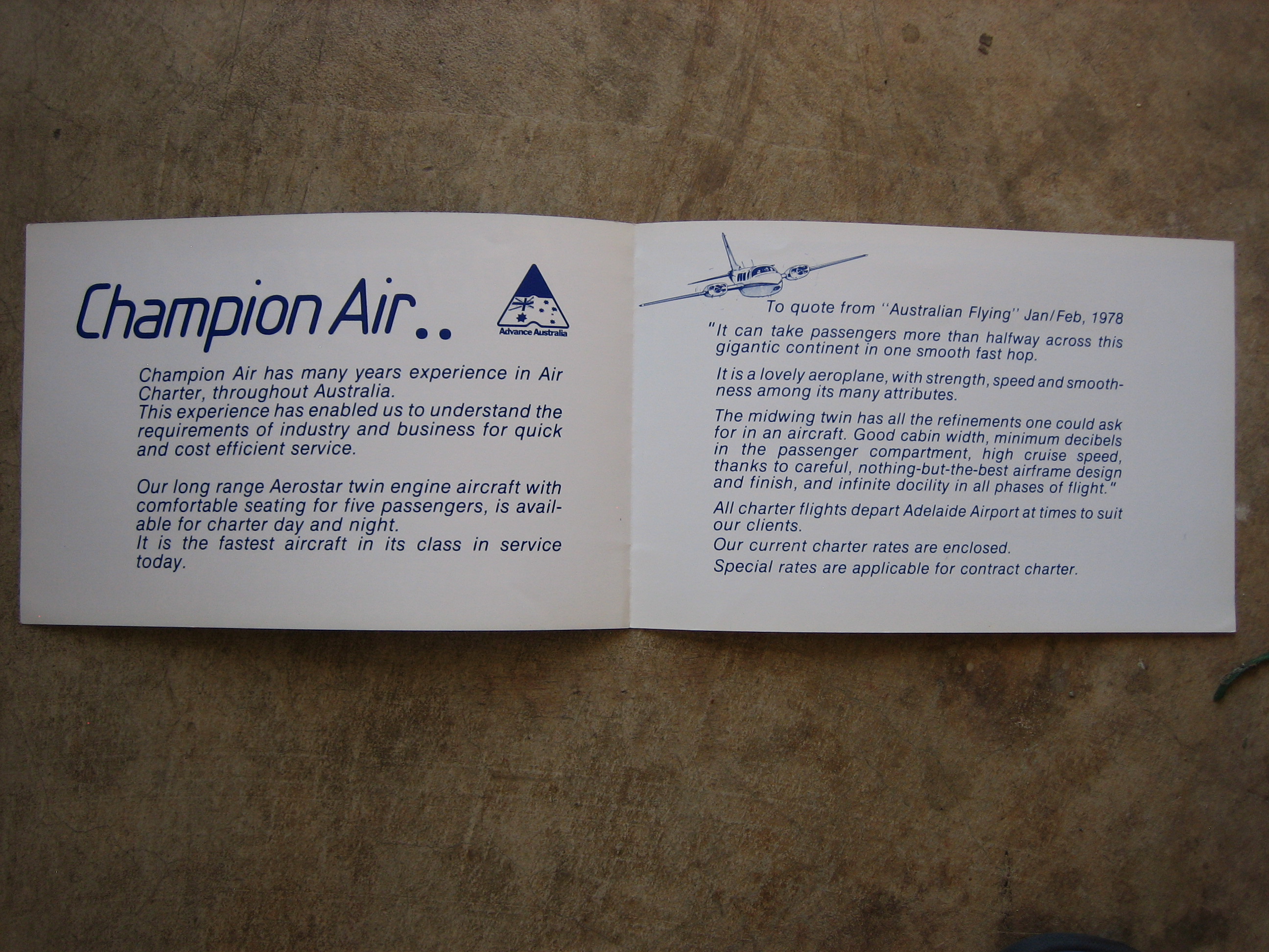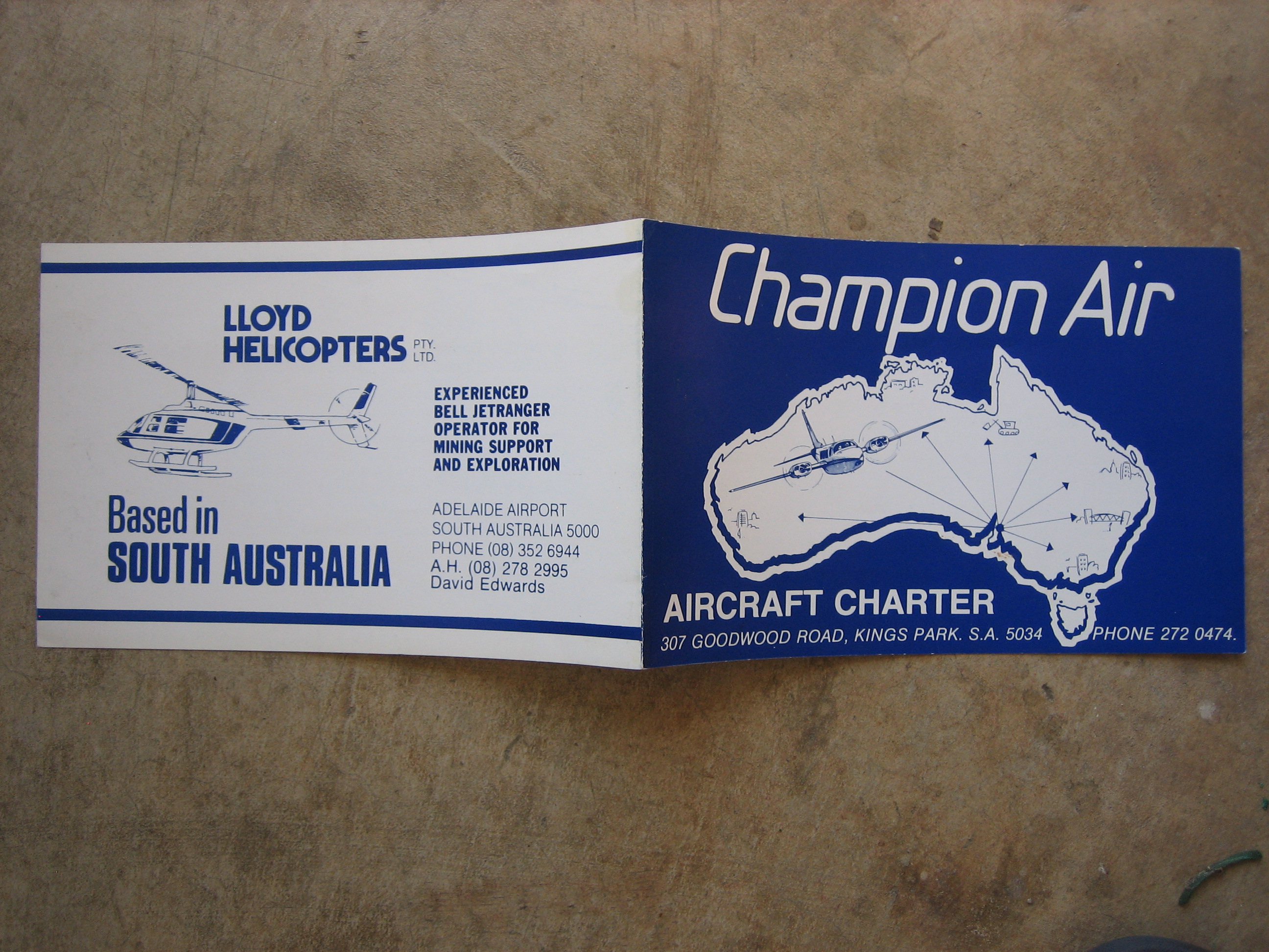 | MSC3. | Champion Air , A Uncommon Champion Air of Australia aircraft charter brochure, C.1980/1981. Item measures 8 3/4" x 5 3/4", and two paged. The back cover is advertising LLOYD HELICOPERS PTY. LTD., used Inside | EX $5.00 |