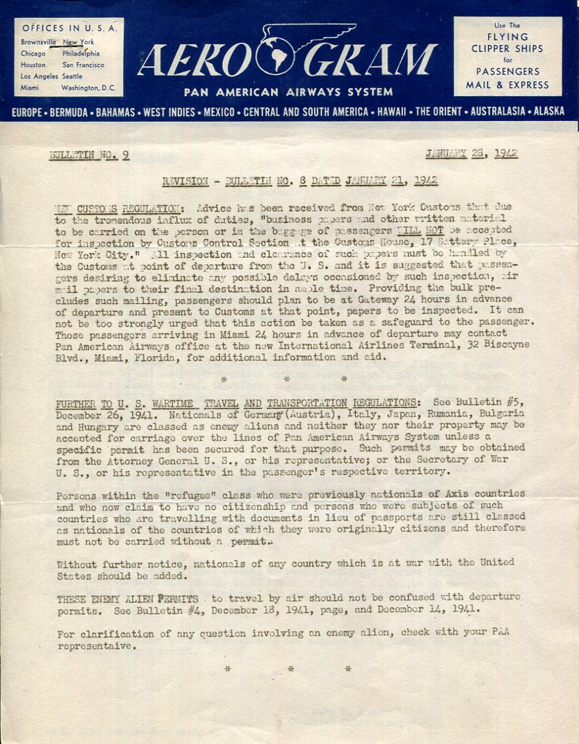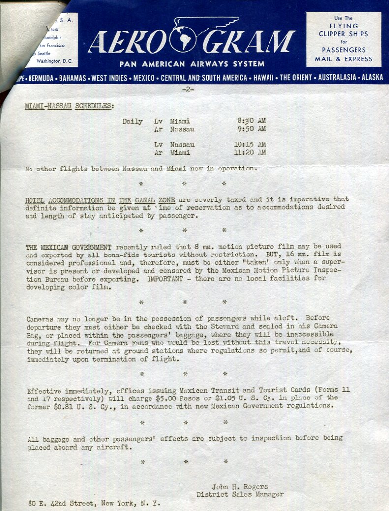 | MSC31. | PAA AeroGram , A Very RARE Pan American Airways System World War 2 issued " AREOGRAM" informational news letter dated January 28,1942. Item measures 8 1/2" x 11", and two paged. Also showing there MIAMI-NASSAU schedule/timetable, used 2nd Page w/Schedule | EX $25.00 |