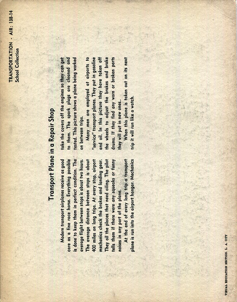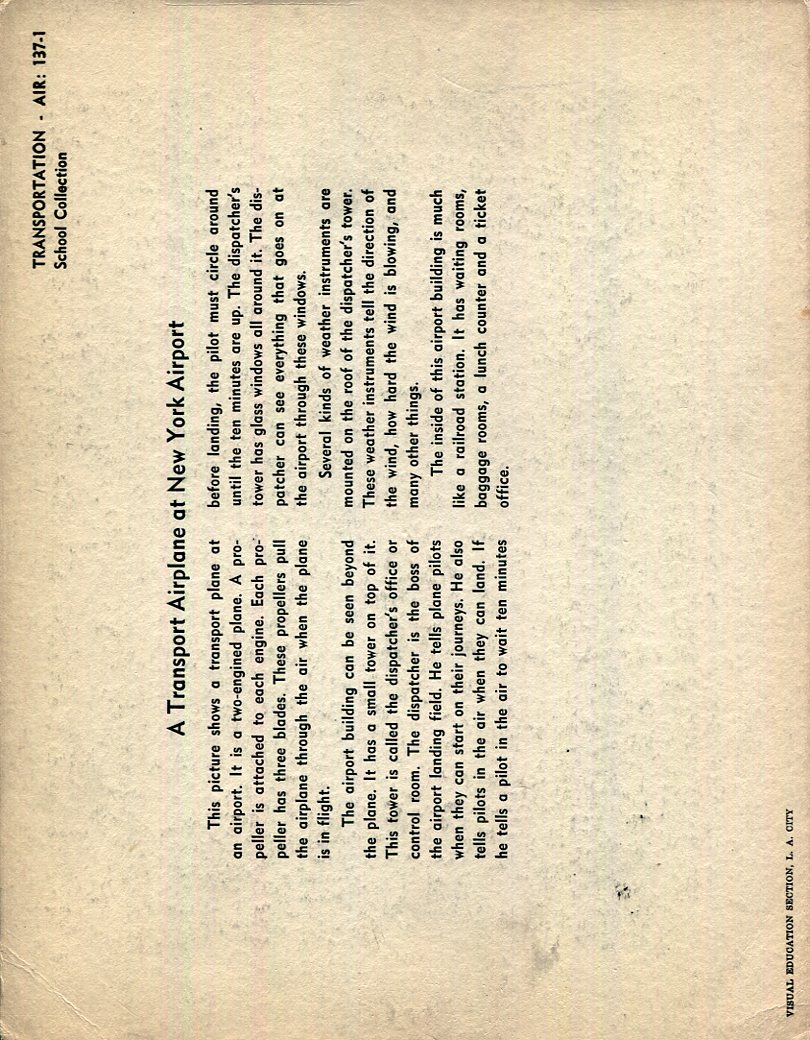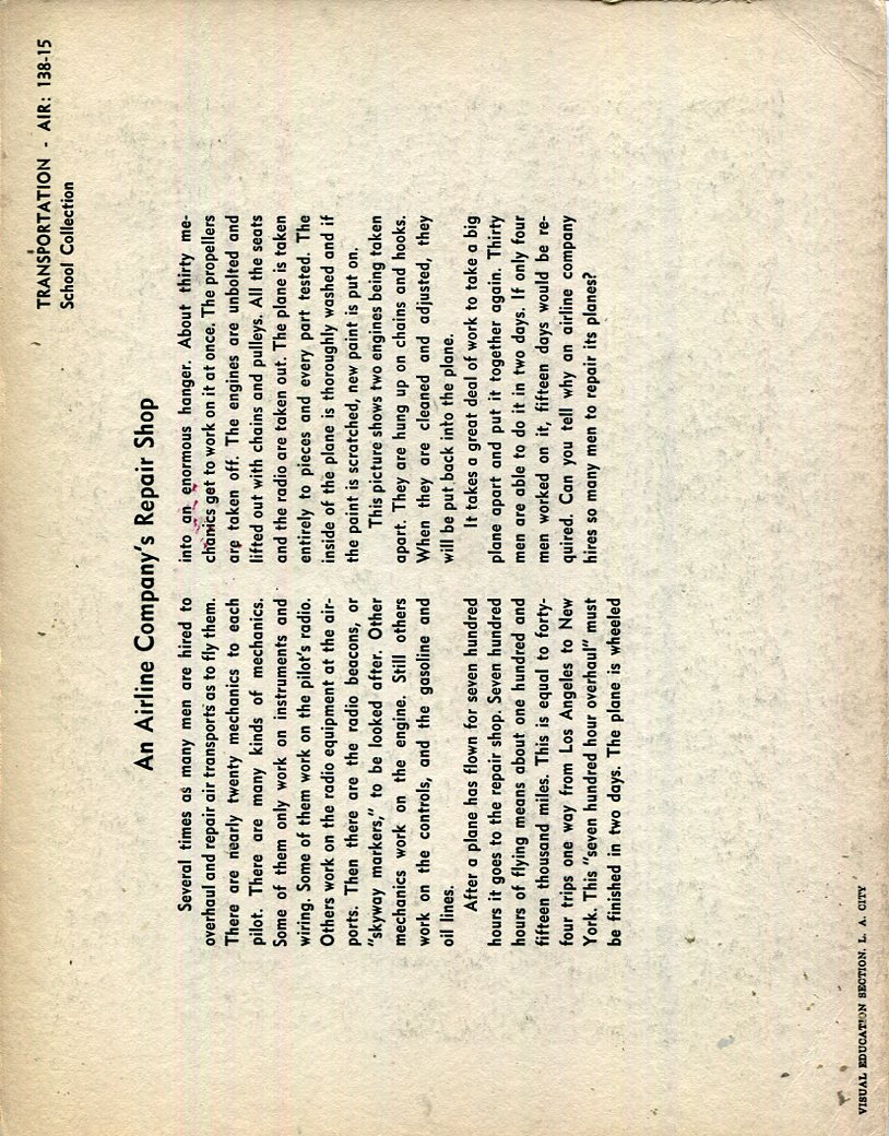 | MSC33. | UNITED AIR LINES , A Scarce group of three United Air Lines DC-3 'TRANSPORTATION-AIR " School Collection from the Visual Education Section aids, published in L.A. City. Items measure 11" x 8 1/2" light+/moderate cor. wear & creases, C.1936/1040. I had to Scan the Back and the Front of one Item because my camera made the one aid scan look FUZZY. Hence, the scanning of ALL THE BACKS, used Repair Shop Aid that was FUZZY , Back of FUZZY Repair Aid , Other Back of Repair Shop Aid , New York Airport | VG $18.00 |