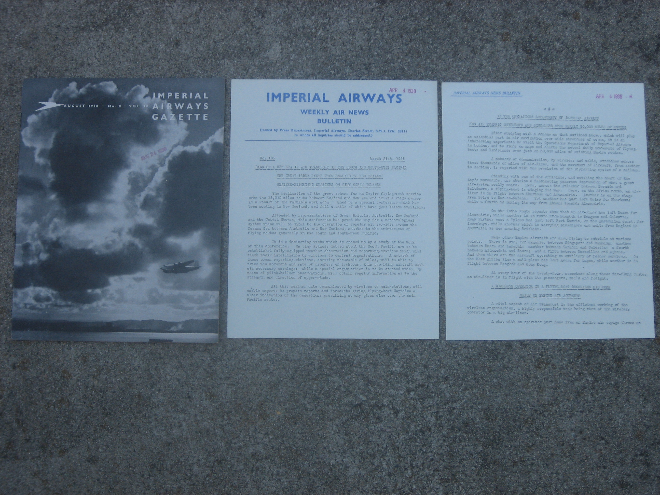 | MSC36. | Imperial Airways , A Cool covered Imperial Airways "GAZETTE" brochure dated August 1938, WITH ACCOMPANYING IMPERIAL AIRWAYS two paged "WEEKLY AIR NEWS BULLETIN" dated April 1938. The brochure measures 8" x 10 1/4" with 6 pages which include inside pages of Front & Back covers. The 2 paged "Weekly Air News" measures 8" x 10", having Lots of Imperial News like the brochure, used View 1 , Articles of Interest | EX $55.00 |