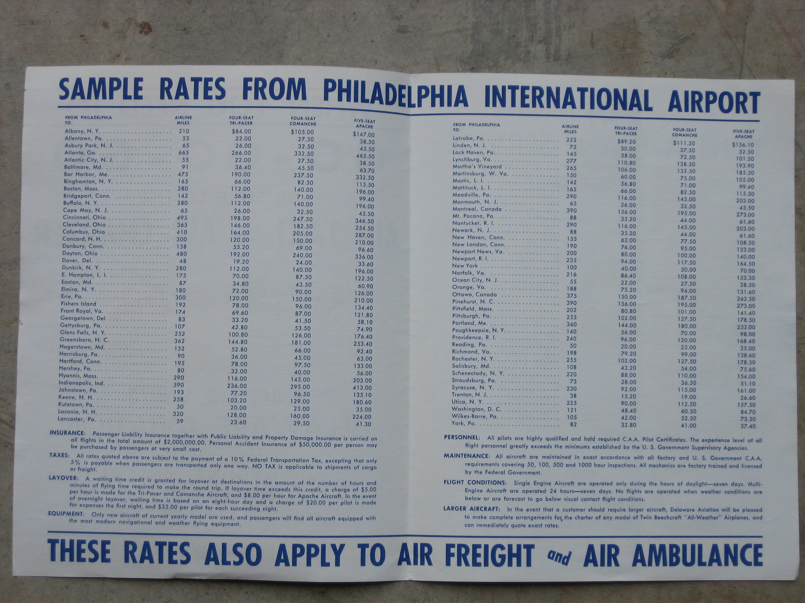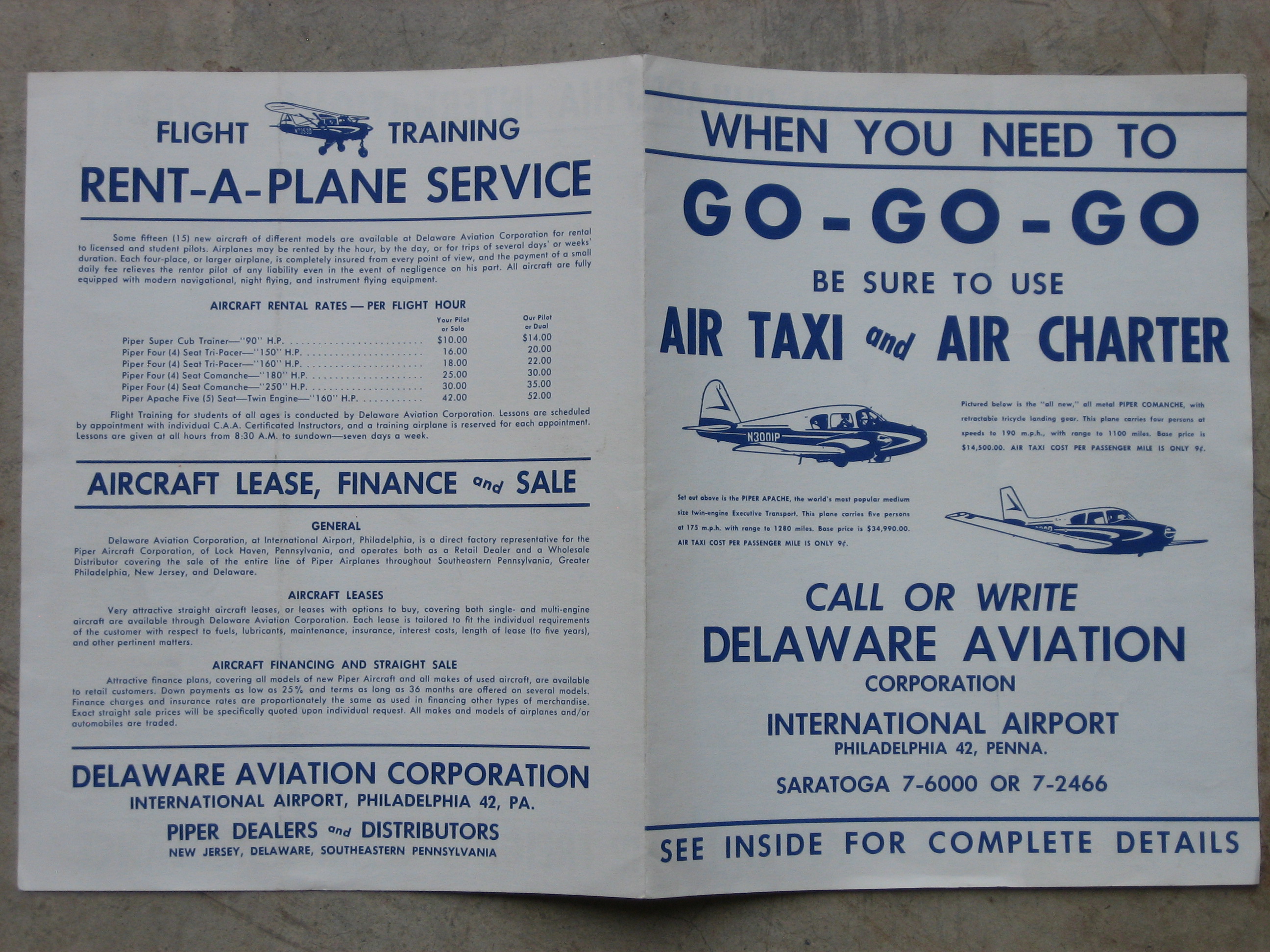 | MSC37. | Delware Aviation , A Unique and Cool covered Delware Aviation Apache Air Taxi & Piper Comanche Air Charter, Air Freight & Air Ambulance tariff brochure. Item measures 8 1/2" x 11", two paged with a light vertical crease. On the back cover is "Flight Training Rent-A-Plane Servive program. Also, Aircraft Lease, Finance and Sale program. JUDGING BY THE "TRI-PACER" AIRCRAFT ON THE BACK, I'D SAY C.1958, used Immediate Inside | EX $7.00 |