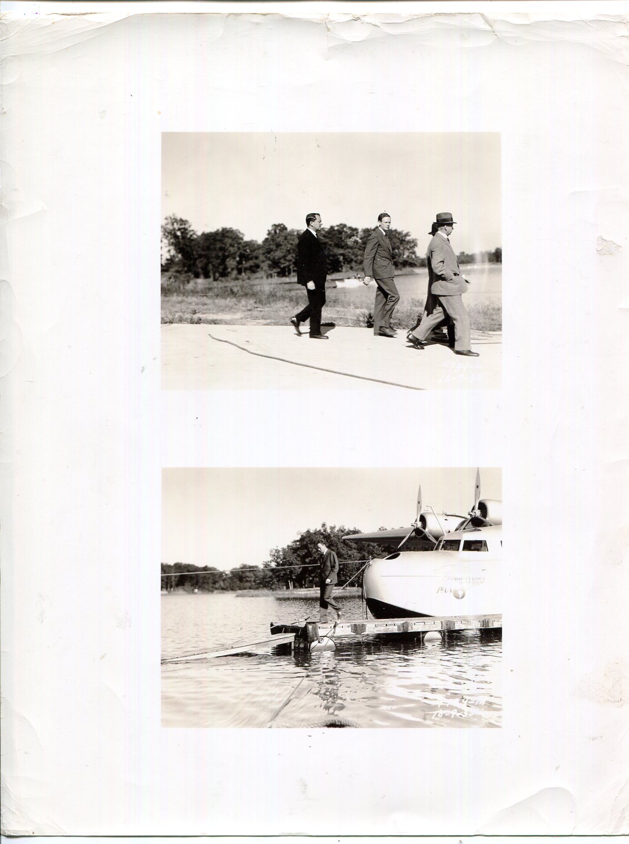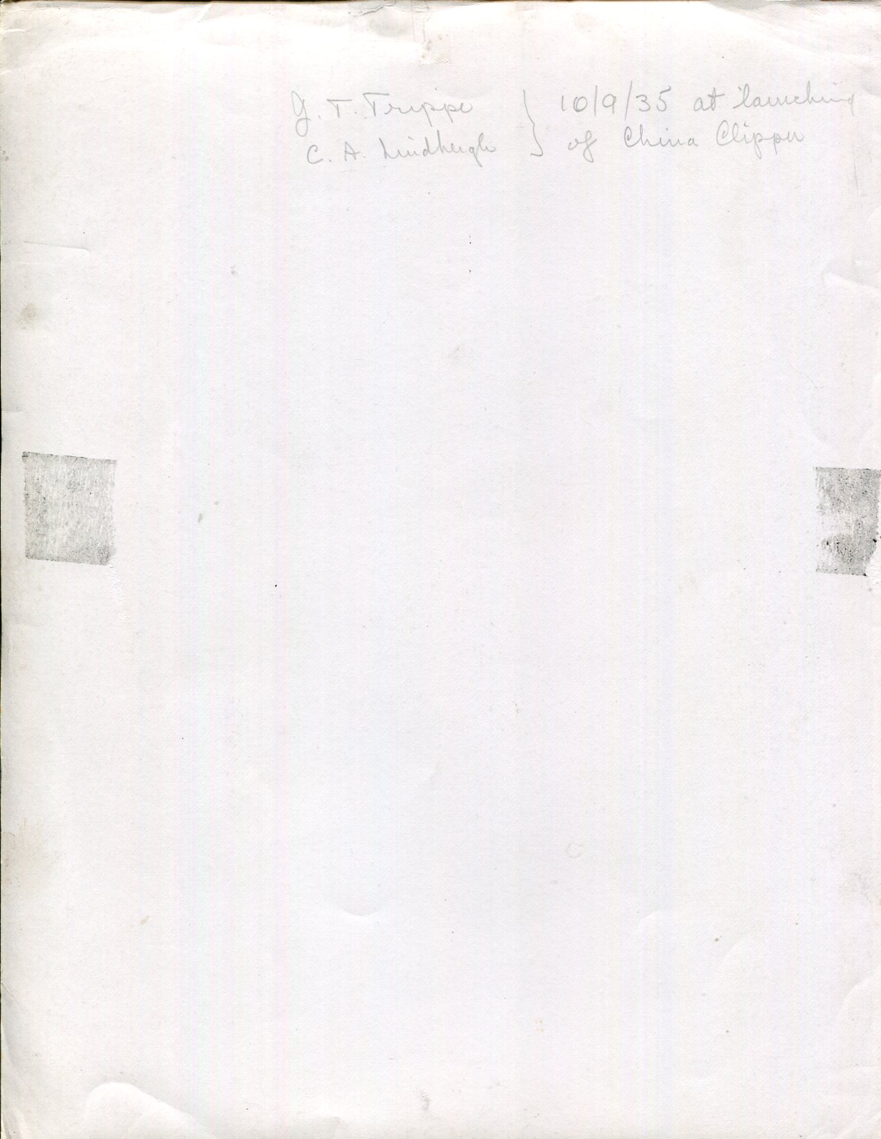 MSC39. | J.Tripp & C.Lindbergh , A Very Scarce photograph dated 10/9/1935 of PAA's President Juan Tripp and Charles Lindbergh walking towards Pan American Airways Martin 130 flying boat photograph. Item measures 8 1/2" x 11" with creases through-out, and two small top border tears. AS the First flight was on November 29,1935, I think this them visiting/inspecting the M-130 , used Back | G $10.00 |