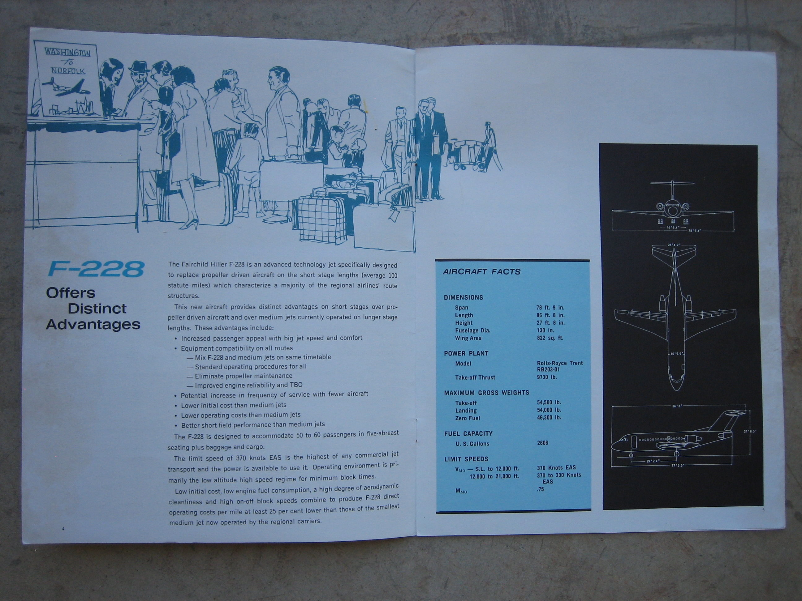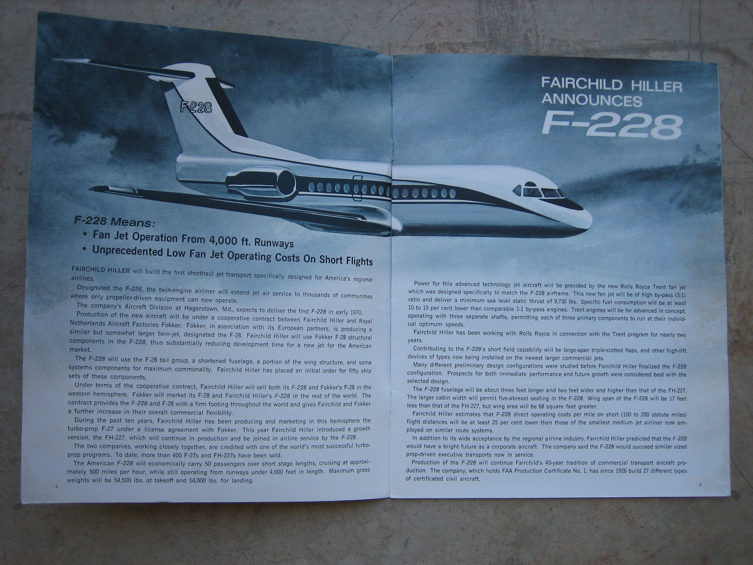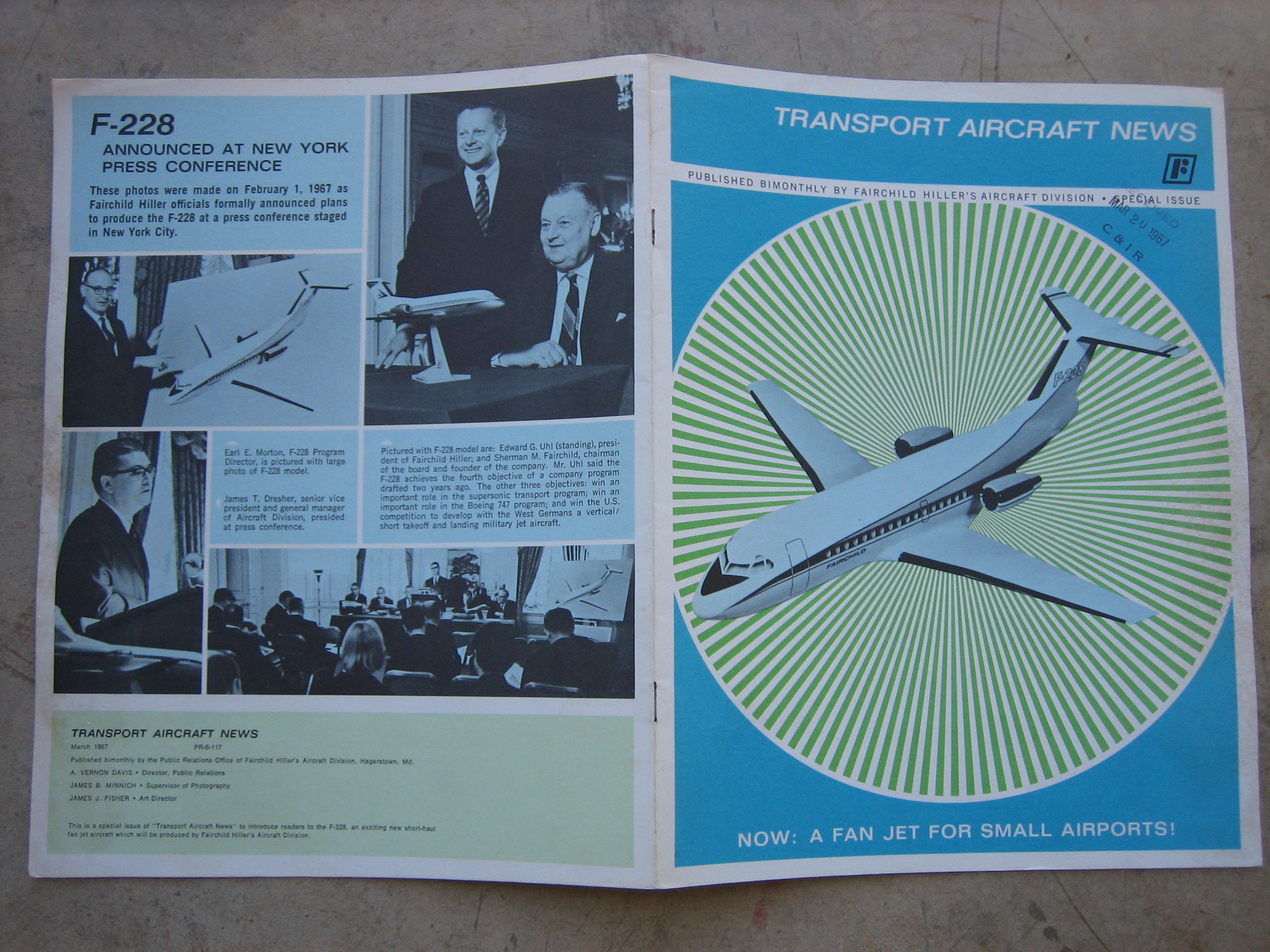 | MSC4. | Transport Aircraft News , A Uncommon Transport Aircraft news, "SPECIAL EDITION" Fairchild Hiller Announces F-228 brochure dated March 1967. Item measures 8 1/2" x 11" with 8 pages which includes the front and back cover inside pages. Has some discoloration in the middle part of the covers right border, and shows along part of the left border of inside pages, used View 1 , View 2 , CUT-A-WAY , View 4 , View 5 | VG $12.00 |