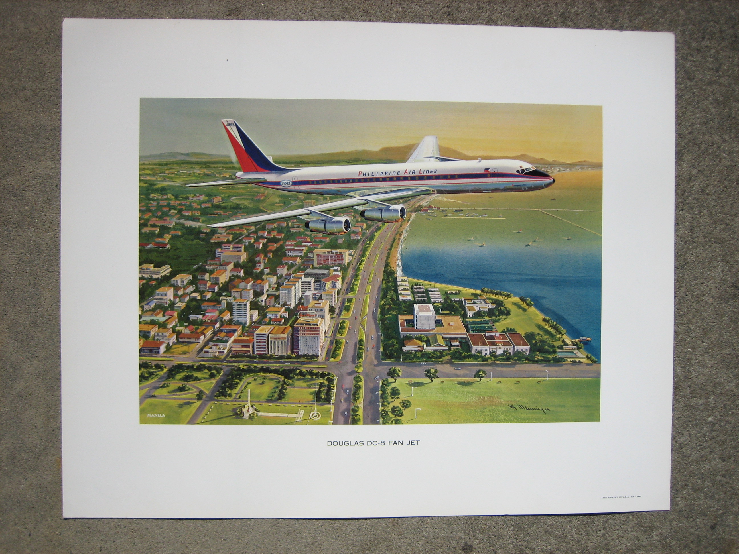 | MSC40. | PAL DC-8 , A Very Cool, and Very Scarce Philippine Airlines DC-8 over Manila poster/print. Item measures 20" x 16" and dated May 1963. Has a light lwr. lft. cor. crease, and once framed or matted, A NON ISSUE. THIS ITEM WILL HAVE TO BE MAILED IN A SMALL TUBE WHICH IS INCLUDED IN THE PRICE, used | EX $20.00 |