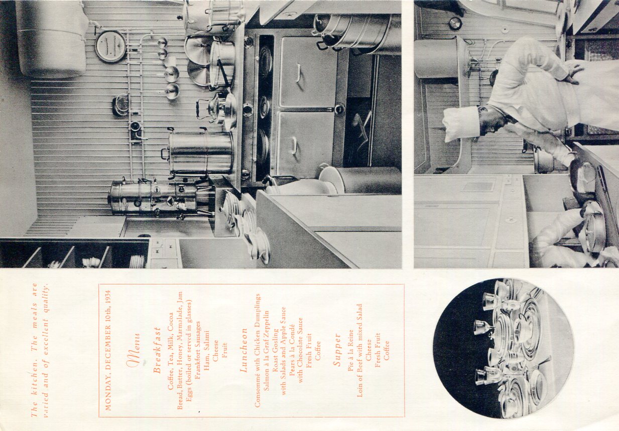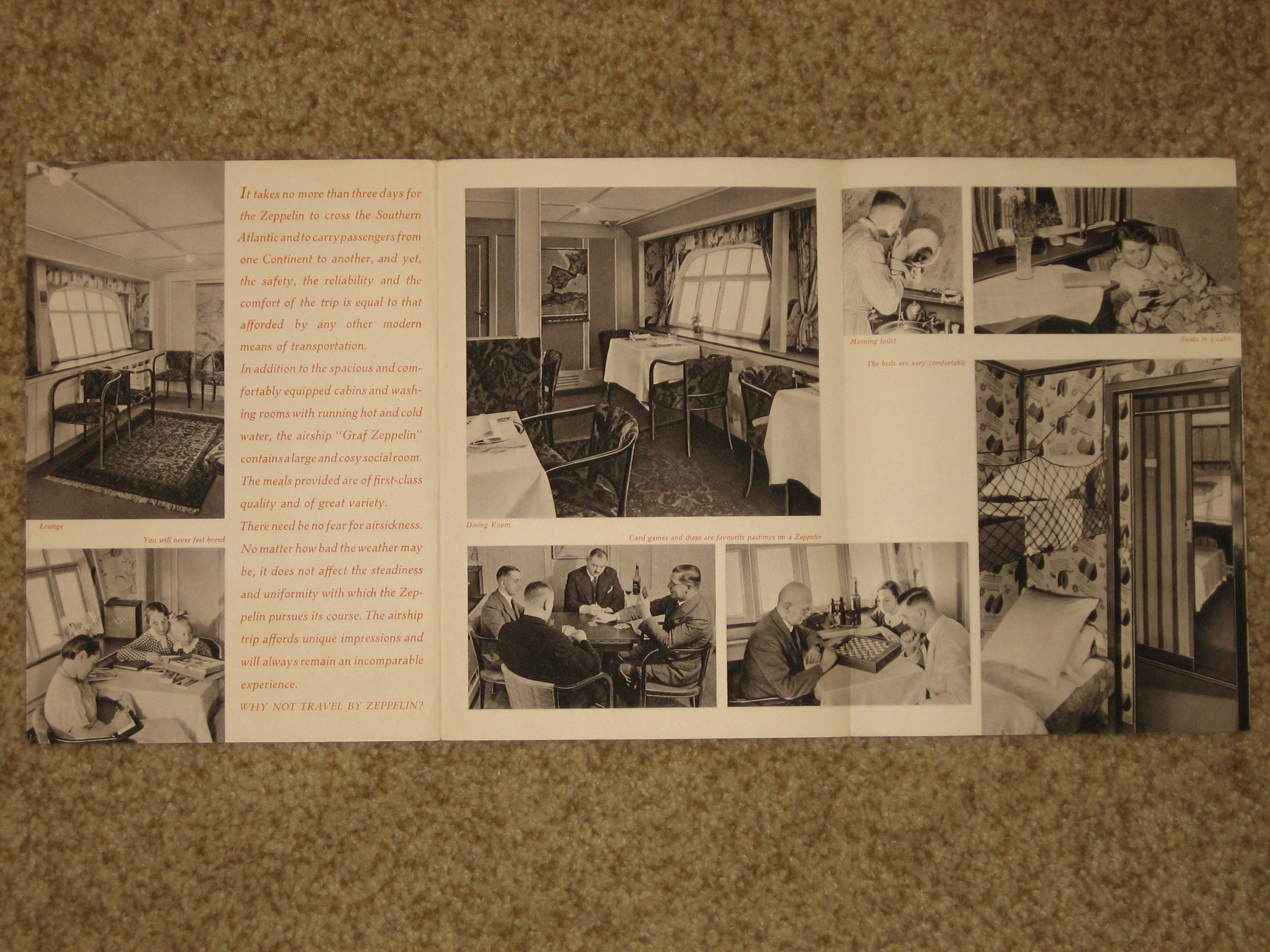 | MSC41. | Deutsche Zeppelin-Reederei , AN EXTREMELY RARE, IN THIS CONDITION, Deutsche Zeppelin-Reederei "GRAF ZEPPELIN" brochure dated December 1934. Item measures 5 7/8" x 8 1/4" with three panels. The TEXT OF THIS BROCHURE IS ENGLISH, with light wear on back lft. corner, used Kitchen & Chef View WITH MENU Inside | EX $130.00 |
