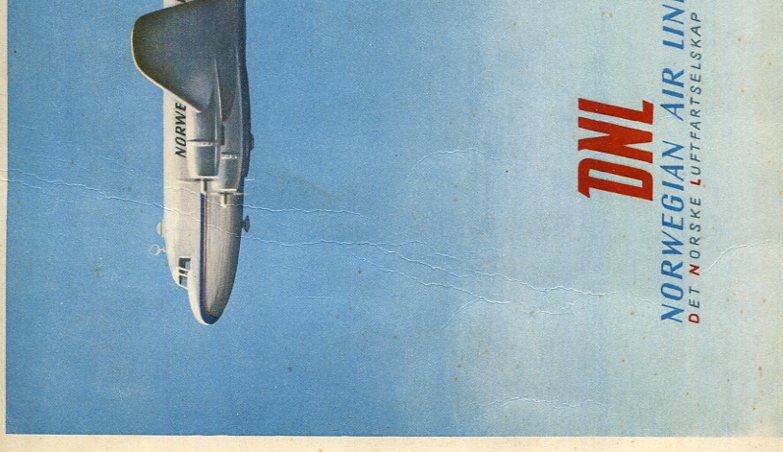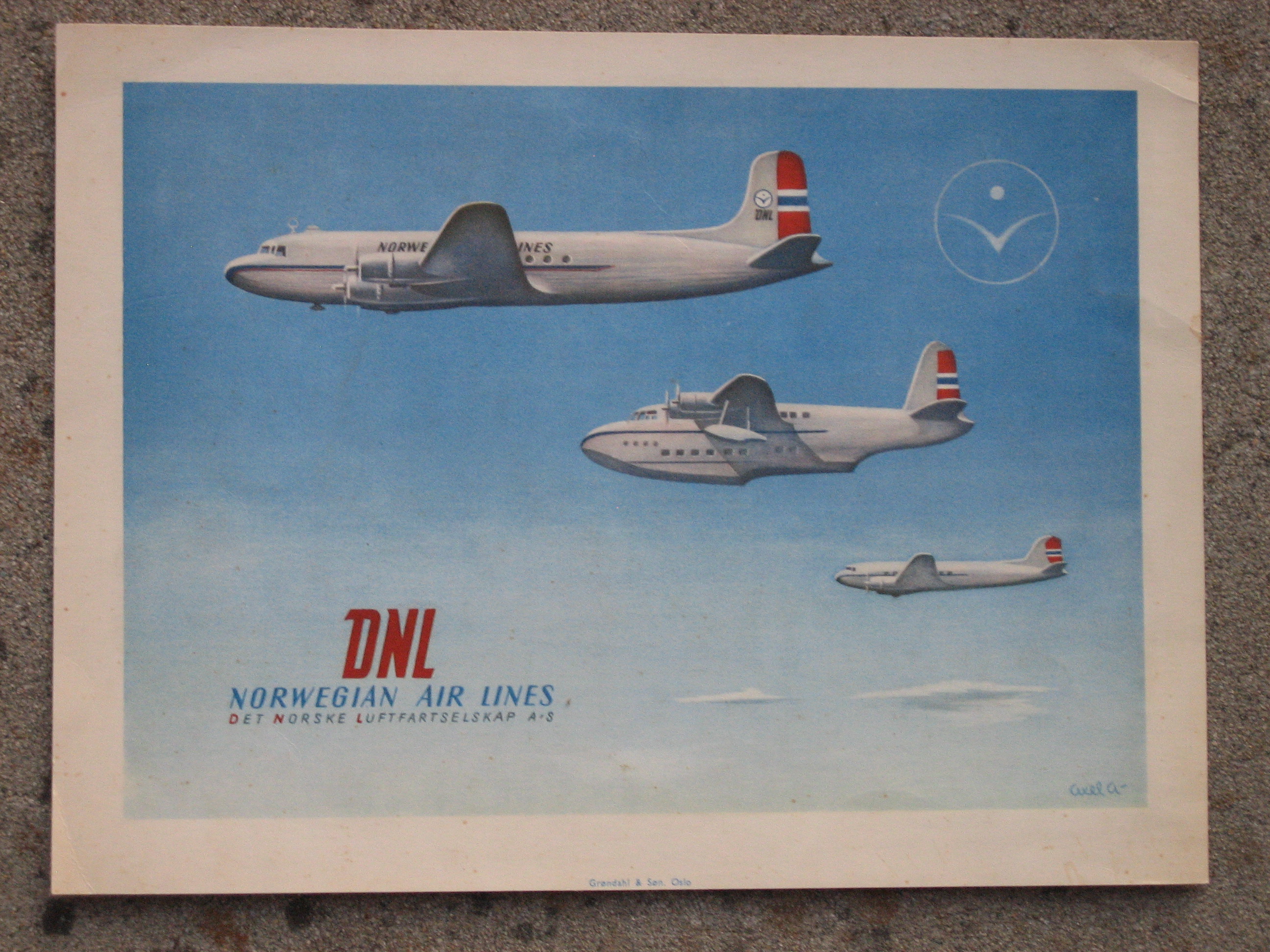 | MSC42. | DNL , A Very COOL DNL, Norwegian Air Lines Color poster/print, C.1946/1950. Item measures 13 1/4" x 9 7/8". As U CAN SEE DESPITE THE CREASES, THE PRINT SHOWW VERY WELL TO THE NAKED EYE. DNL operated DC-4s, Sandringham Mark V1 flying boats and DC-3s from 1947 to 1951, used Creases , Back | G+ $10.00 |