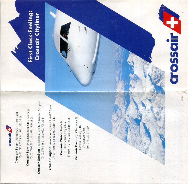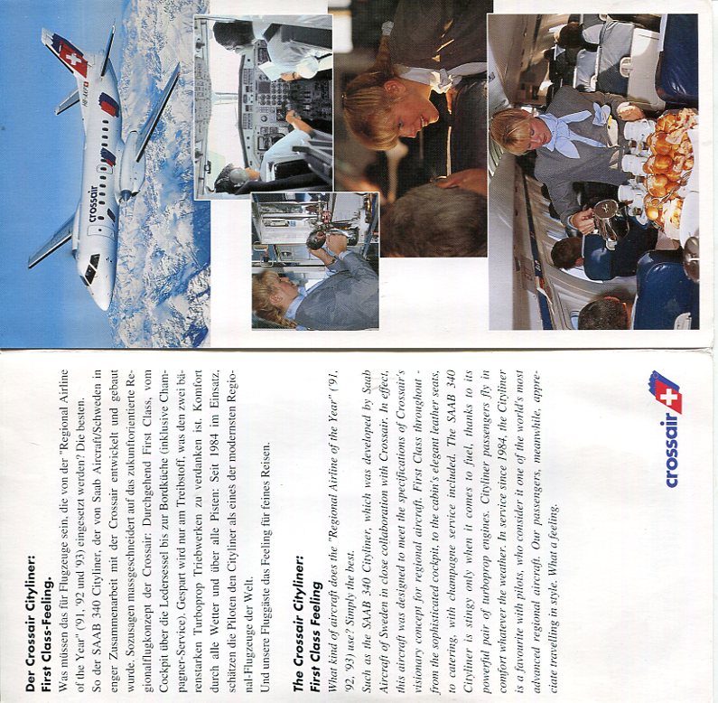 | MSC43. | Crossair , A Cool Crossair Saab 340 brochure, C.1986/1990. Item measures 4" X 8 1/4" with three panels, WITH A GREAT CUT-A-WAY AND SPECIFICATIONS, used View 1 , CUT-A-WAY VIEW | EX $7.00 |