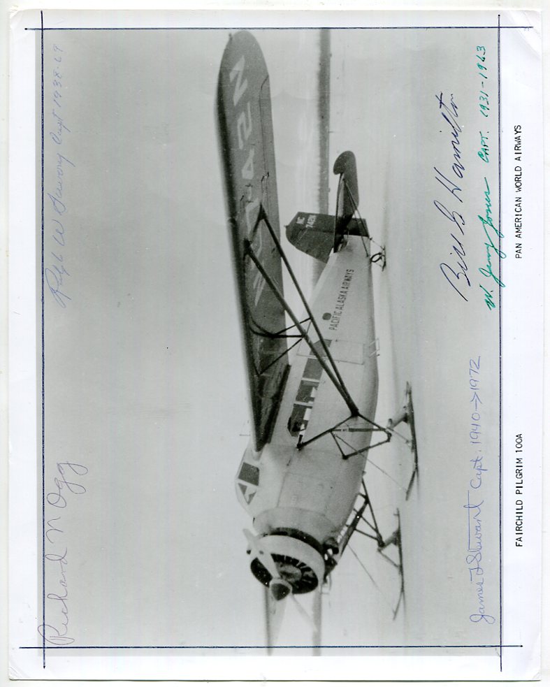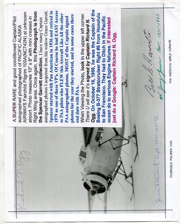 | MSC5. | Pacific Alaska, 'THE CORRECT IMAGE IS NOW SHOWING". I CAN GUARANTEE U, ON PLANET EARTH, THERE IS NOT A ANOTHER PACIFIC ALASKA AIRWAYS, a SUBSIDIARY OF PAN AMERICAN WORLD AIRWAYS, FAIRCHILD PILGRIM 100A "PILOT AUTOGRAPHED" PHOTOGRAPH. Photo measures 10" x 8". Has a lwr. rt. cor. creases and mini creases in and around the right wing, unused Photo W/O Note , Back | VG $199.00 |