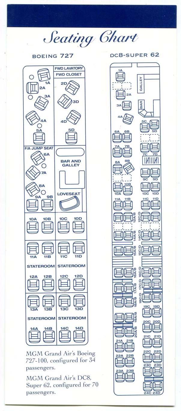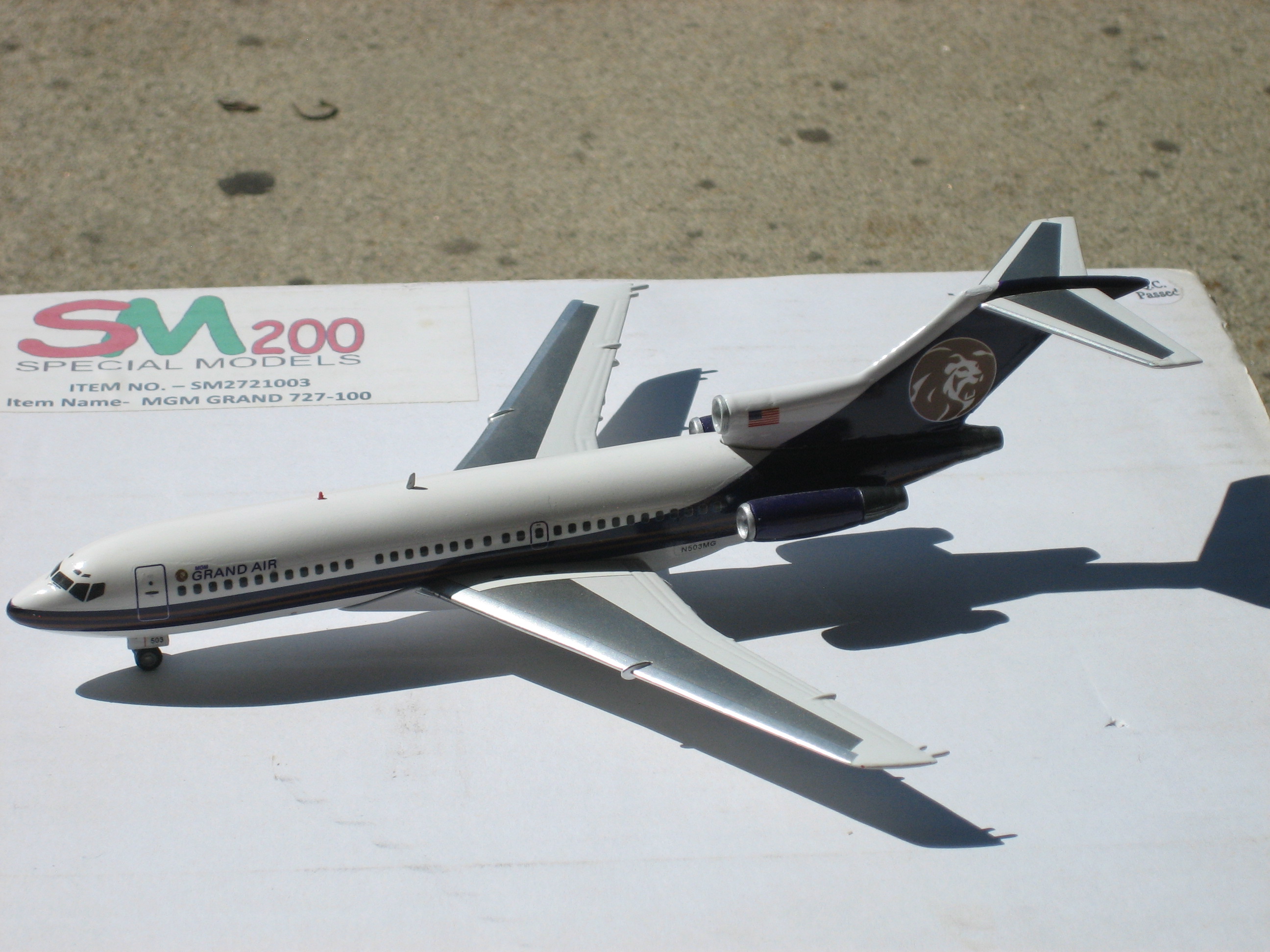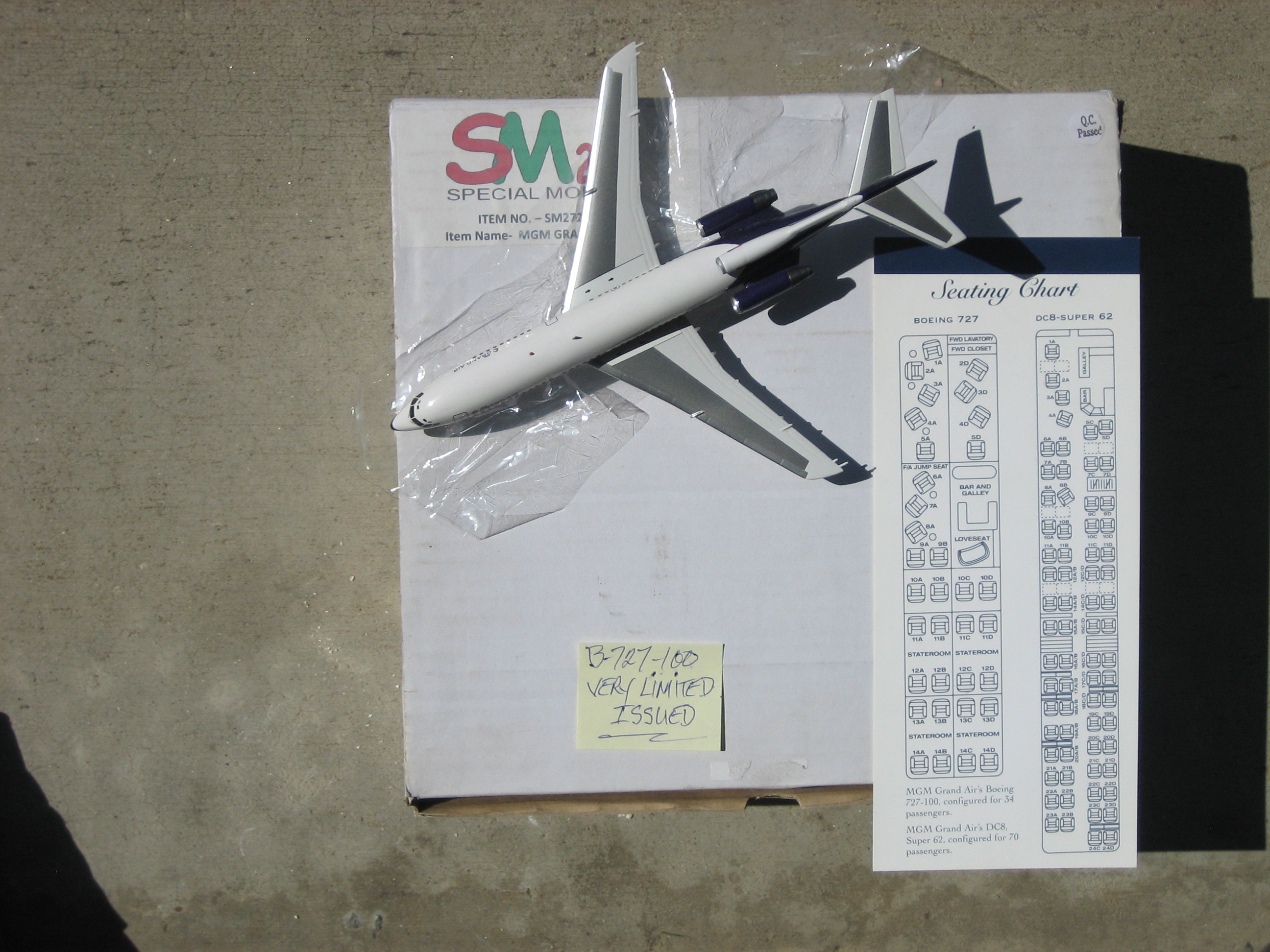 MSC8. | MGM Grand B-727-100 , An Extremely RARE SM200 LIMITED EDITION(120) MGM Grand B-727-100 1/200 scale model and accompanying MGM Grand "Seating Chart" for there B-727-100 and Super DC-8-62. The Chart measures 3 3/4" x 8 7/8", and is single sided, used View 1 , View 2 , TAIL , Seating Chart | EX $170.00 |