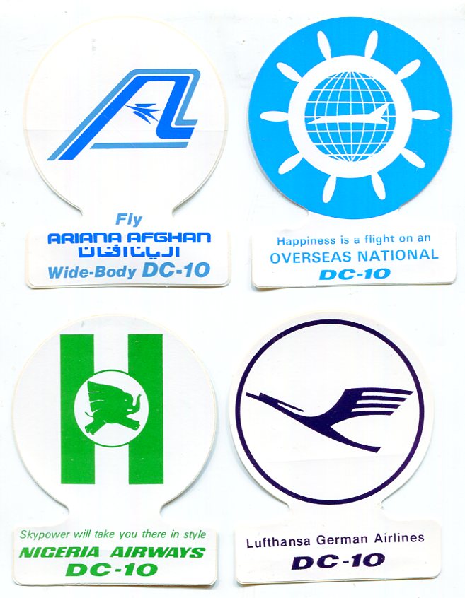 MSC9. | DC-10 Labels , A Nice group of Four different Airline DC-10 labels. All measure 3"x 4", a peel off back type. These type of labels are listed $4.50 to $17.95 EACH on Ebay, used | EX $10.00 |