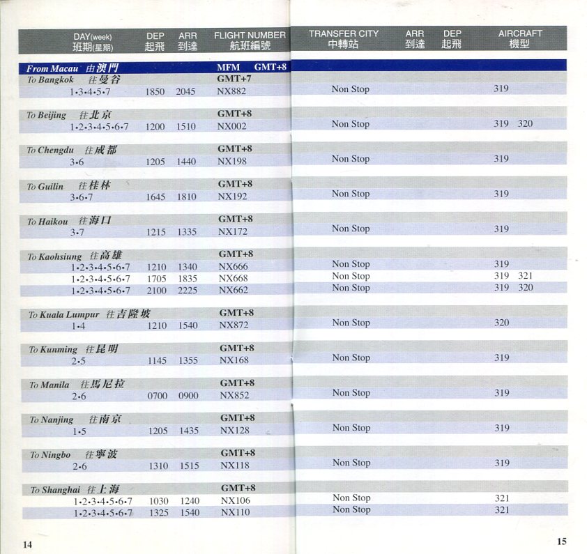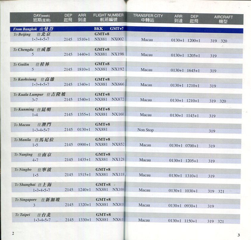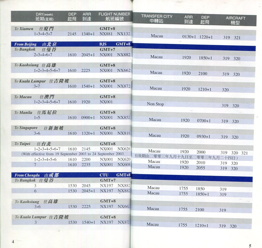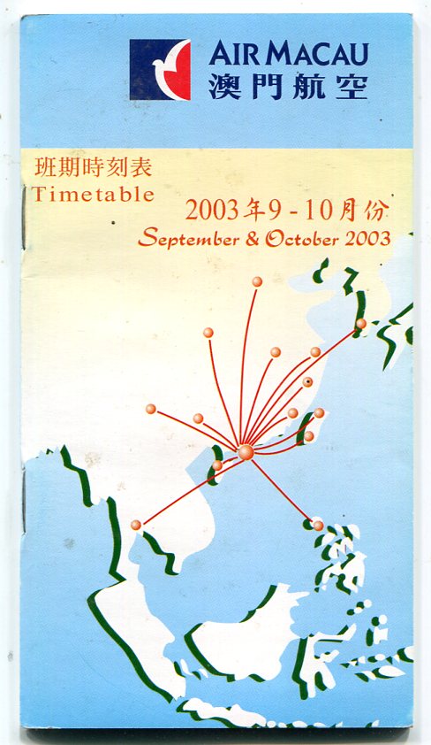 TAB1. | Air Macau , A Air Macau of China system schedule dated Sept. 10,2003. TT measures 3" x 5 3/8" with 31 pages, used Schedule , Schedule , Schedule , Schedule | EX $4.00 |