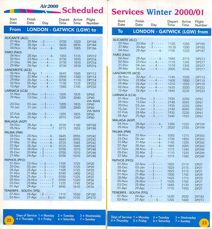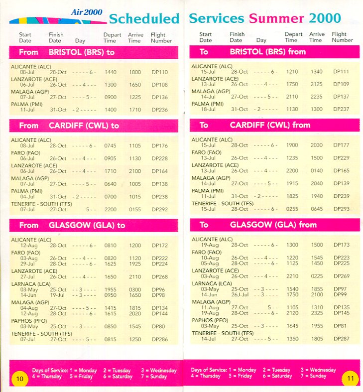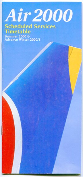 TAB10. | Air 2000 , A Air 2000 of the U.K. schedule dated Summer 2000. TT measures 3 7/8" x 8 1/4". I WON'T BOTHER GIVING ANY INFORMATION AS U CAN GOOGLE THE INFO., used Fleet Information , Sample Schedules , Sample Schedules , | EX $4.00 |