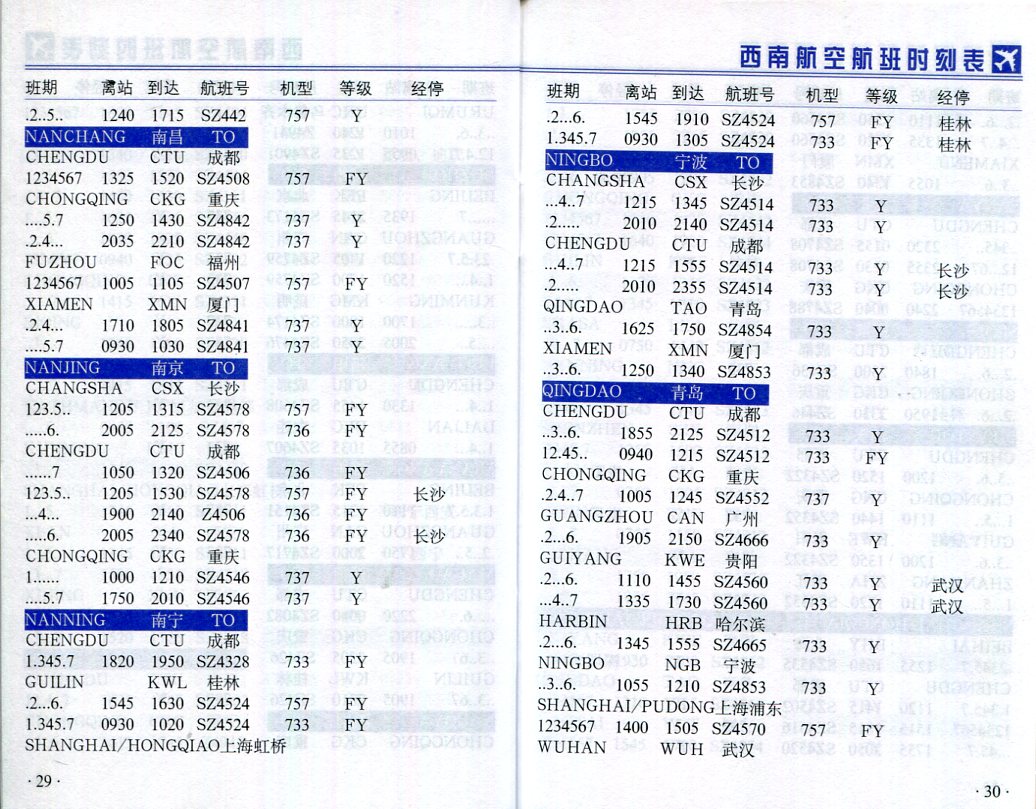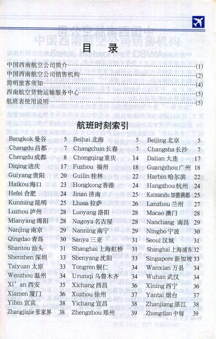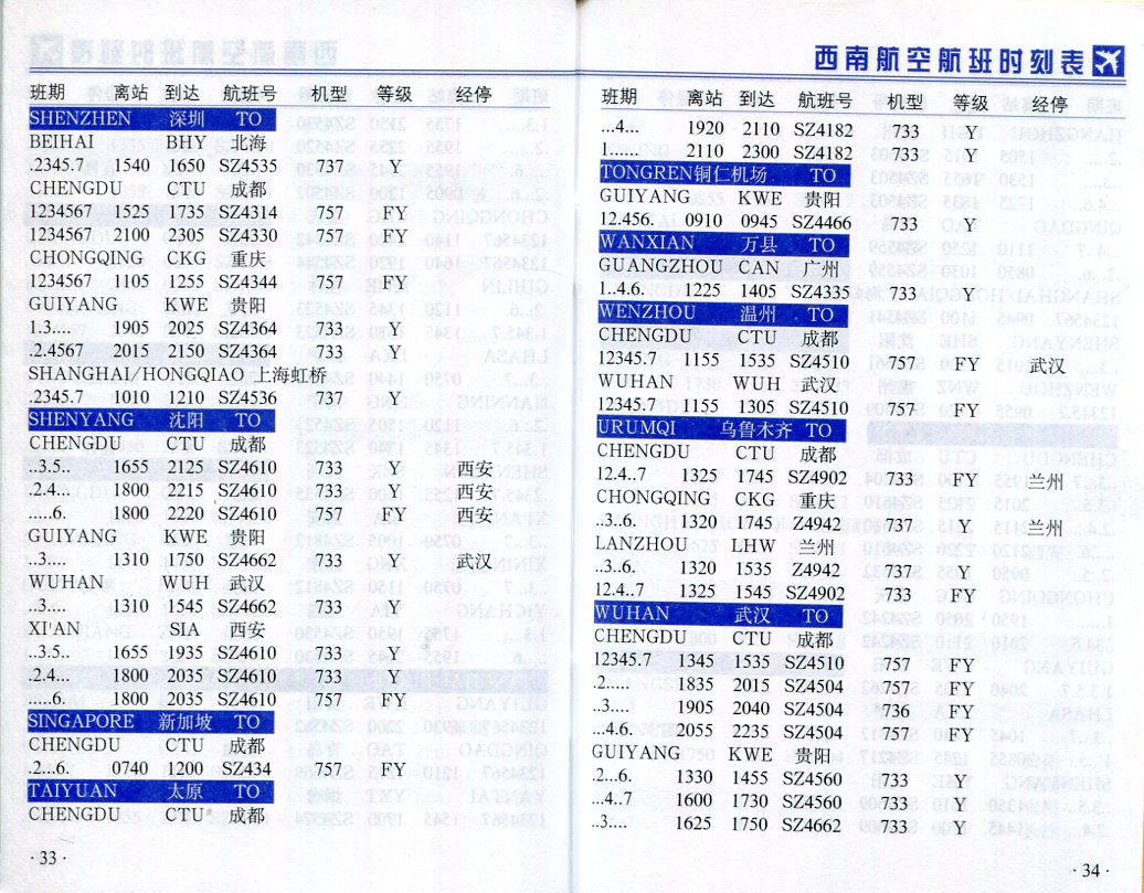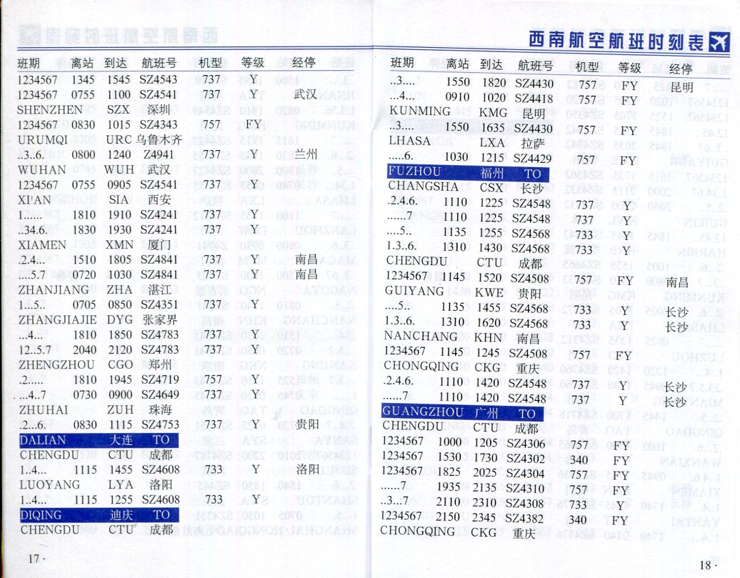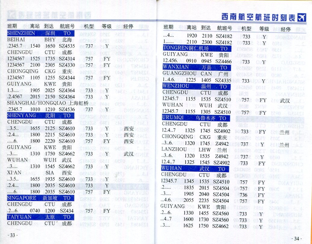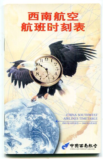 TAB11. | China Southwest , A China Southwest airline schedule dated October 28,2001. TT measures 3 1/2" x 5 1/2" with 39 pages. Operating a variety of Boeing jets and A-340-300s, used Fleet , Destinations , Schedule , Schedule , Schedule , Schedule | EX $5.00 |