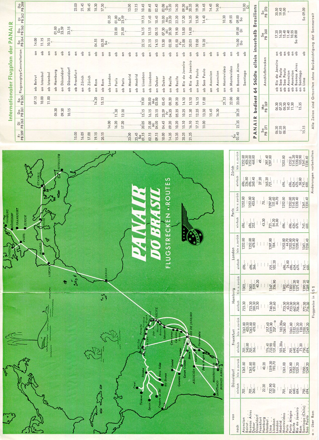 TAB13. | PANAIR , A PANAIR DO BRASIL international schedule dated October 1,1954. TT measures 4" x 8 1/2", three panels and is German issue. They operated L-049 and L-149 Constellations. The L-149 was introduced in the late 1940s and became known for it's Long Range capabilites. Strange thing is, it was used primarily by the military, used Route map & Schedule | EX $23.00 |