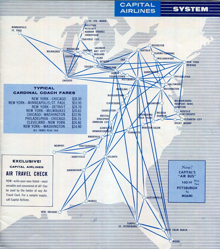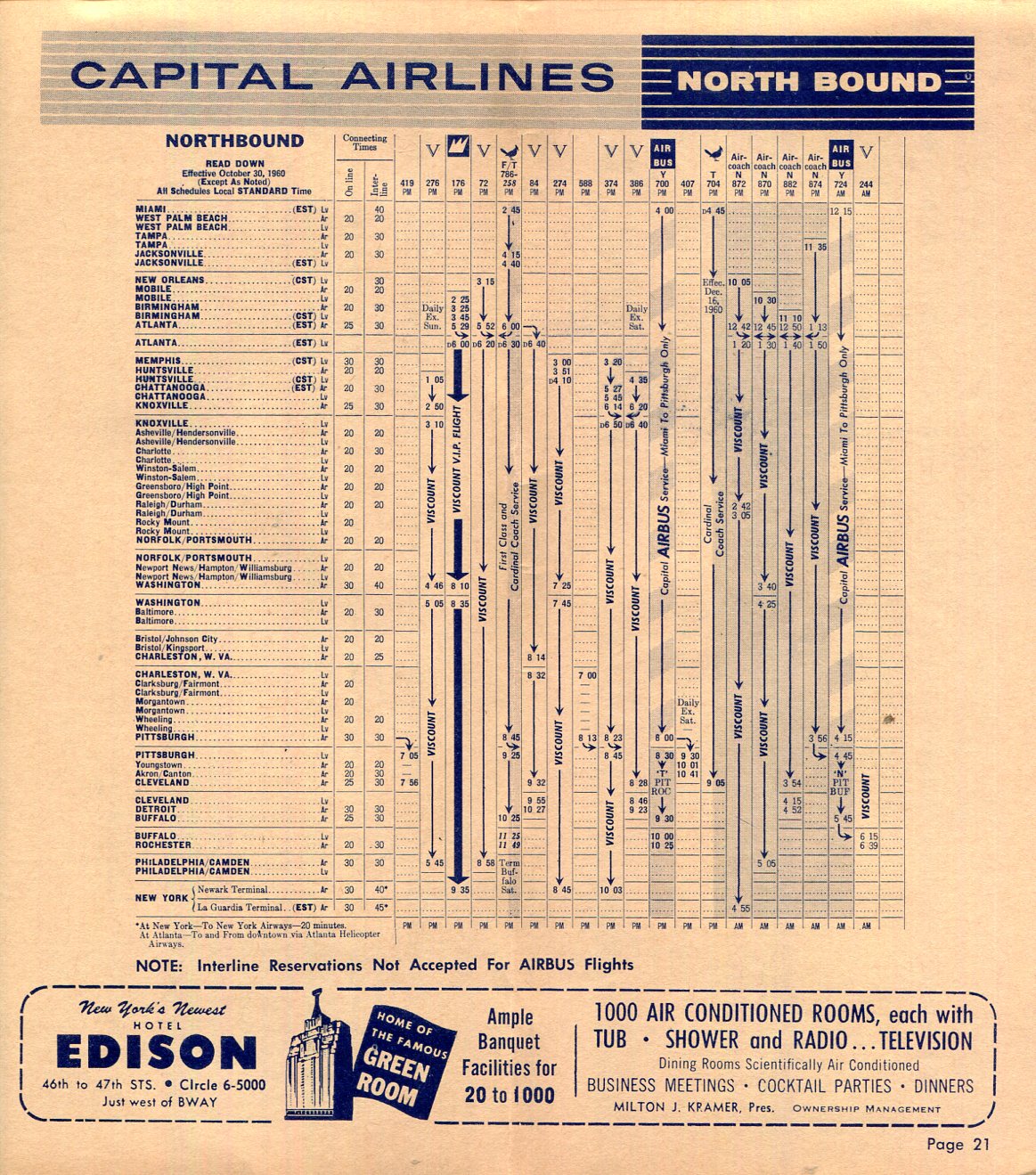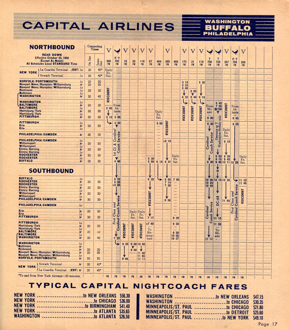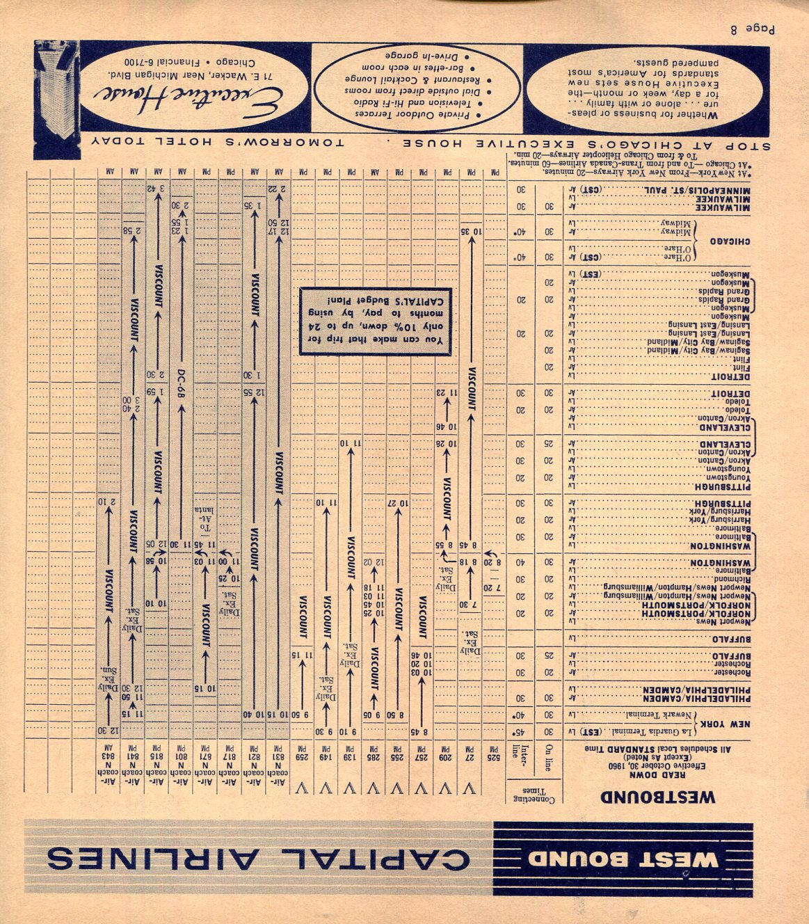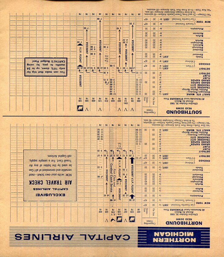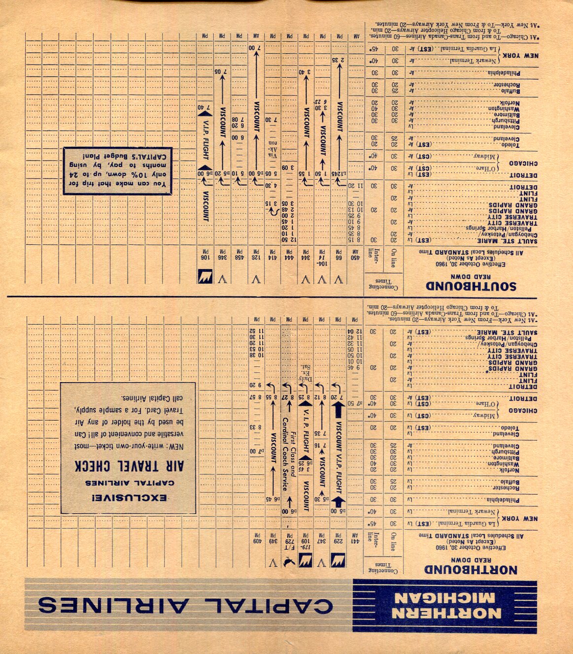 | TAB14. | Capital , A new type covered Capital Airlines system schedule dated October 30,1960. TT measures 4" x 9", four paneled with 27 pages, used Schedule , Schedule , Schedule , Schedule , Schedule , Route Map | EX $19.00 |