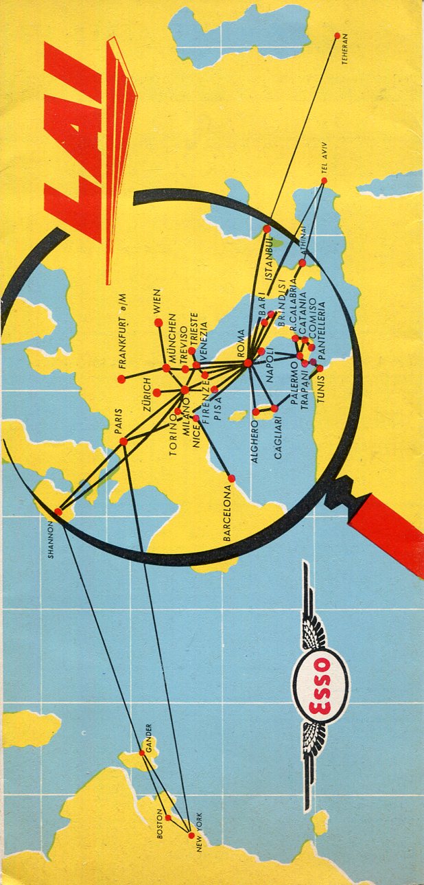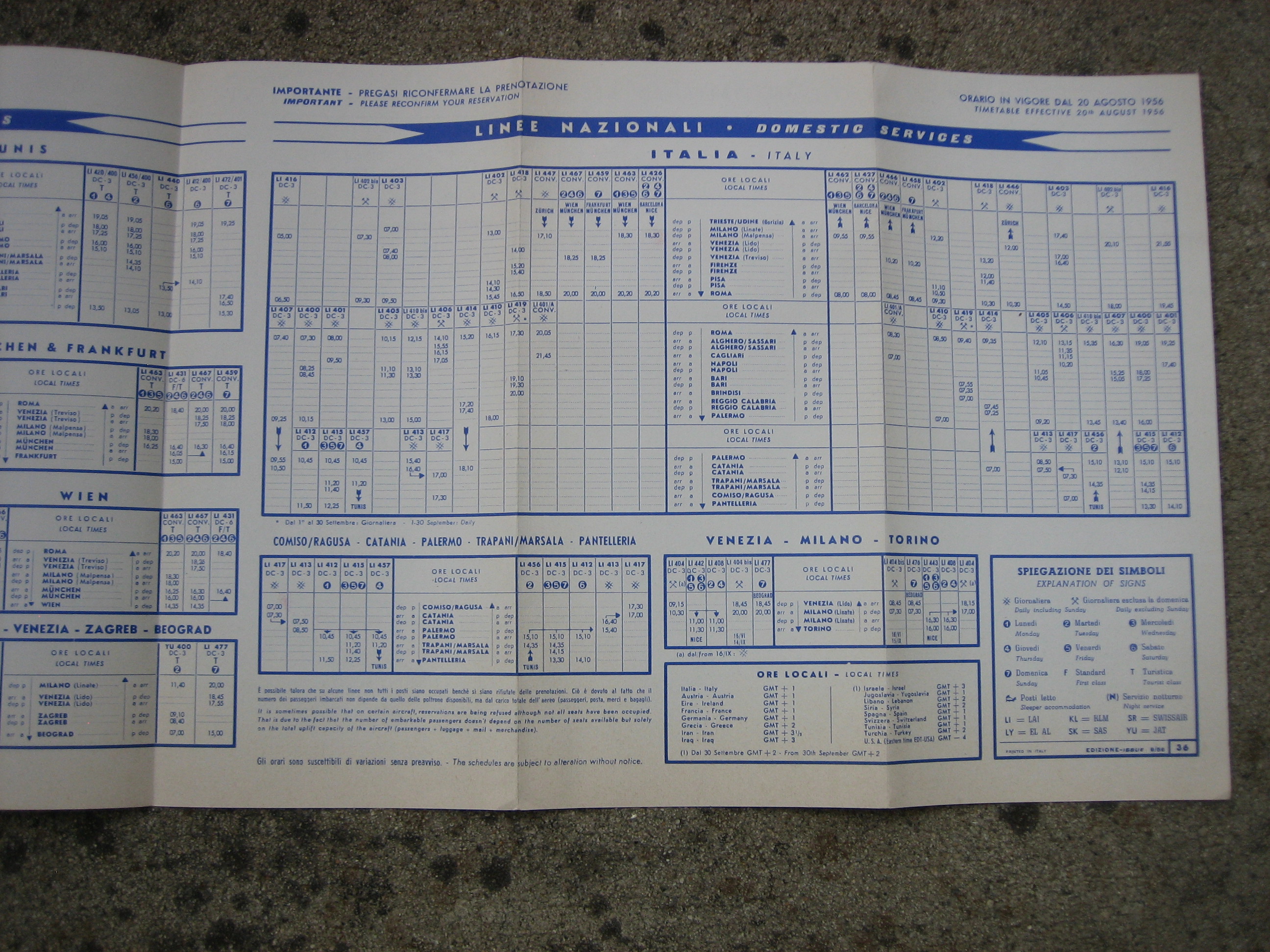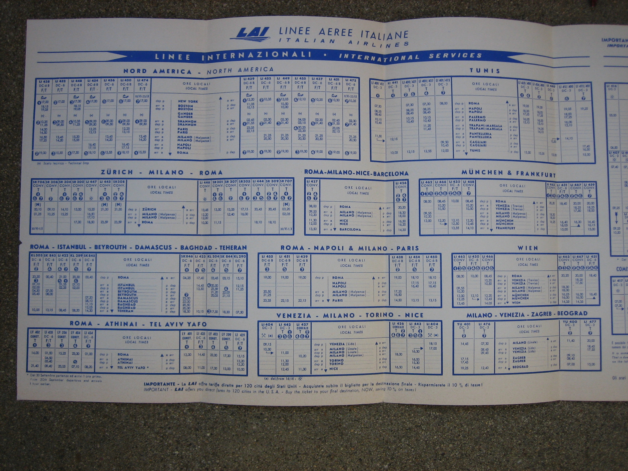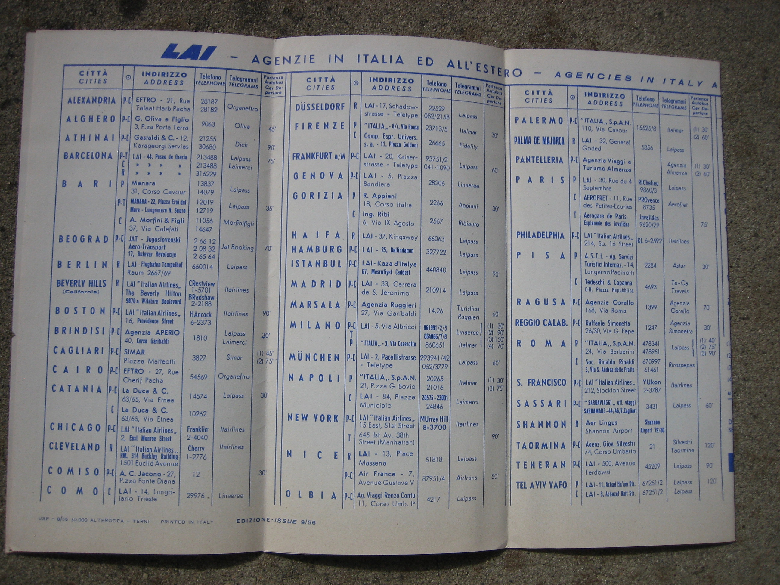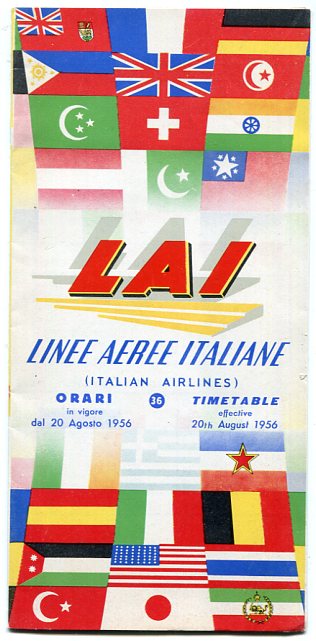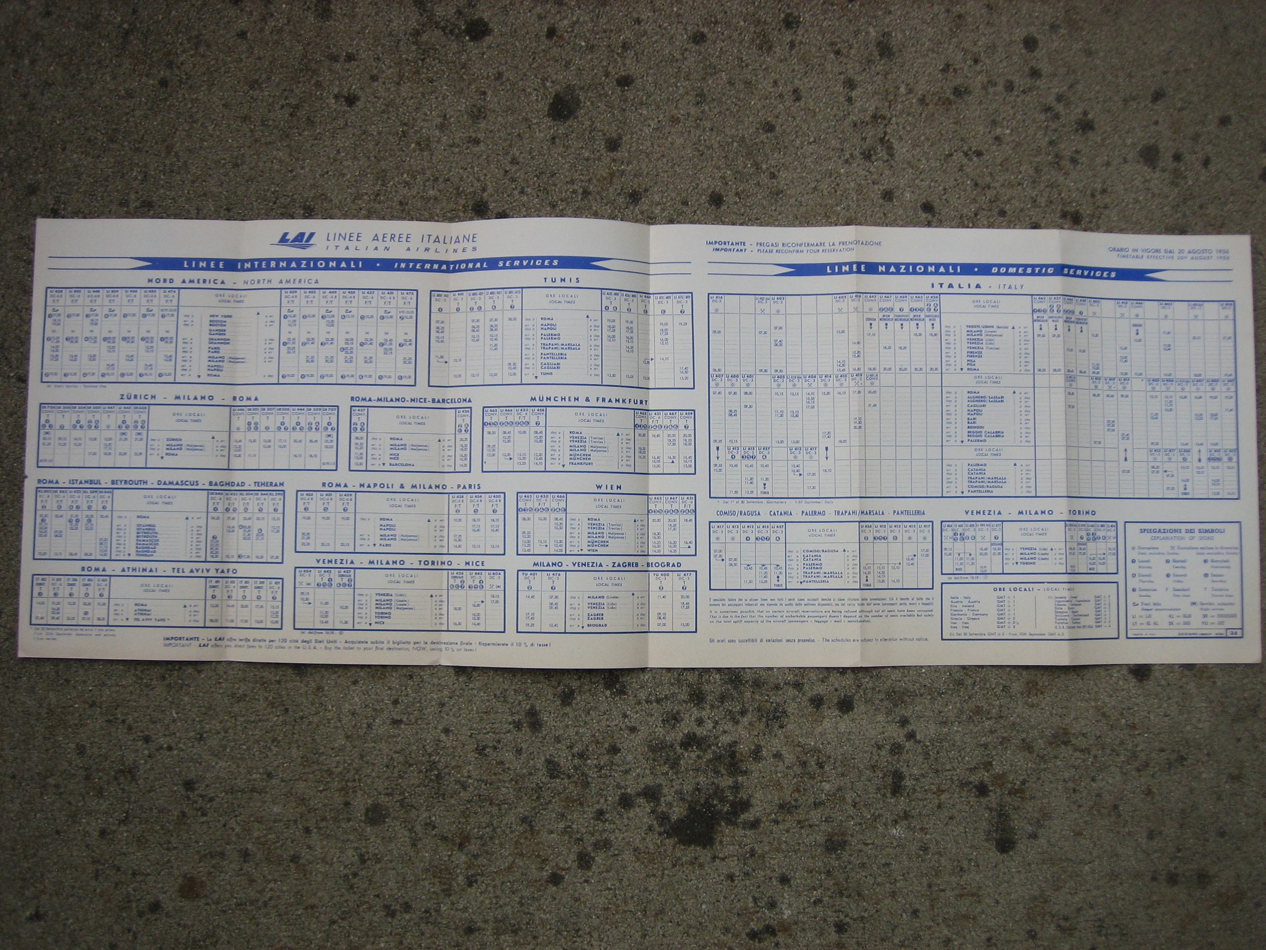 | TAB15. | LAI , A Cool covered LAI, Linee Aeree Italiane system schedule dated 20th August 1956. TT measures 4 1/8" x 8 5/8" with SIX panels. Operating DC-6s and DC-6Bs to North America, Convair 240s and DC-3s. Has a few connecting schedules for El Al, KLM, SAS, Swissair and JAT, used Route Map , LAI Agents Cities , Schedule , Lft. Panel Shown in Schedule , Rt. Panel Shown in Schedule | EX $24.00 |