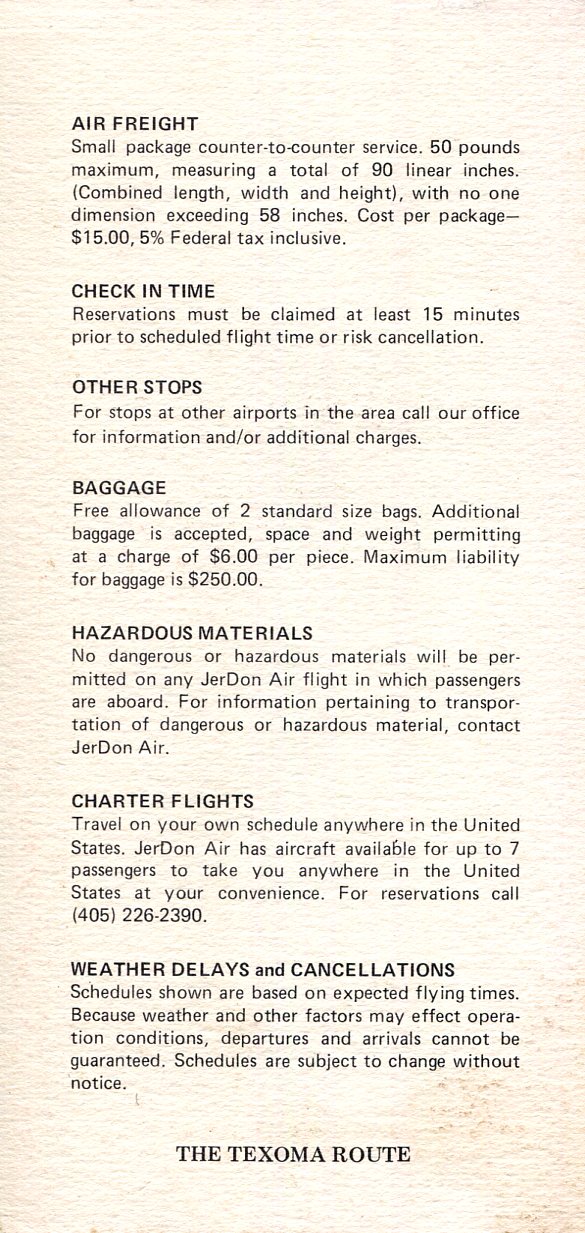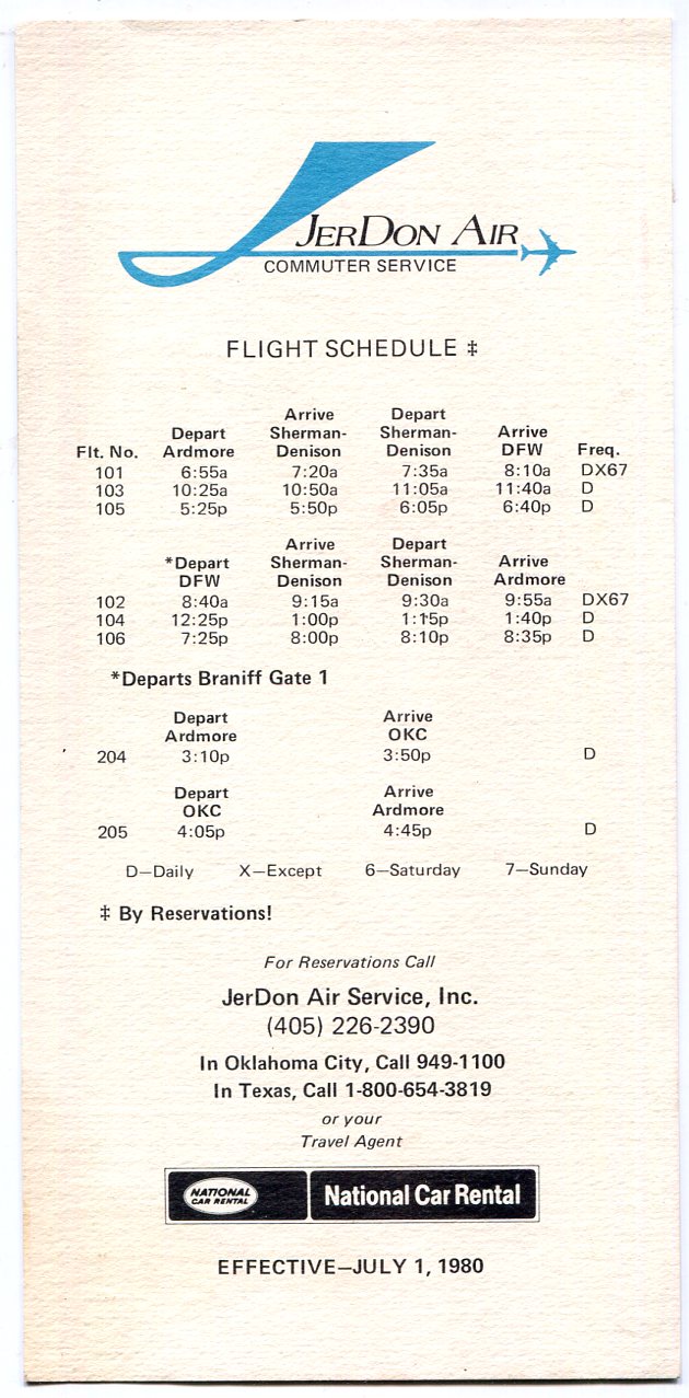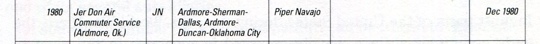 TAB16. | JerDon Air , A Very Scarce JerDon Air Commuter Service of the U.S. schedule dated July 1,1980. TT measures 4" x 8 1/4", a two sided very light card board style. All three reference sources I found say JerDon Air started in 1980. One source says they ceased operations in December 1982; while two says December 1980=this is ONE of those sources shown here, used Back of Schedule , JerDon Air Information | EX $19.00 |