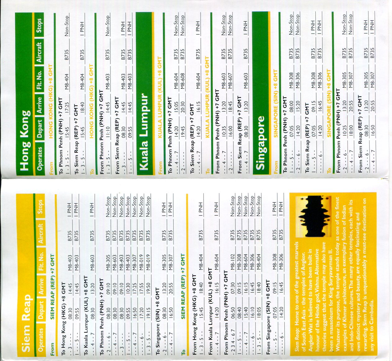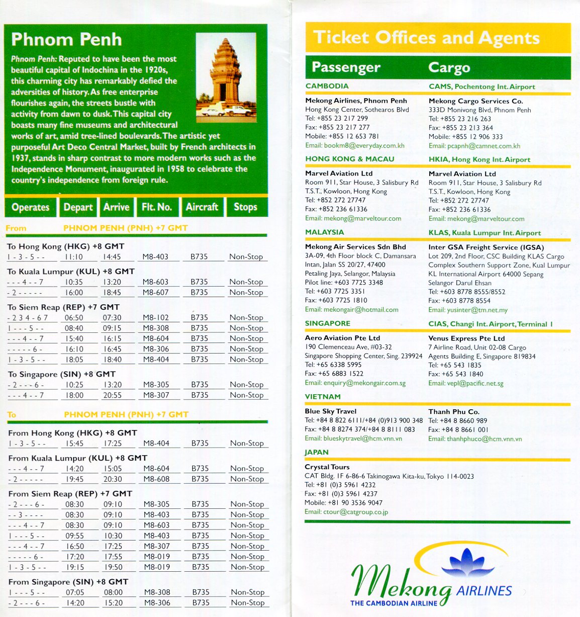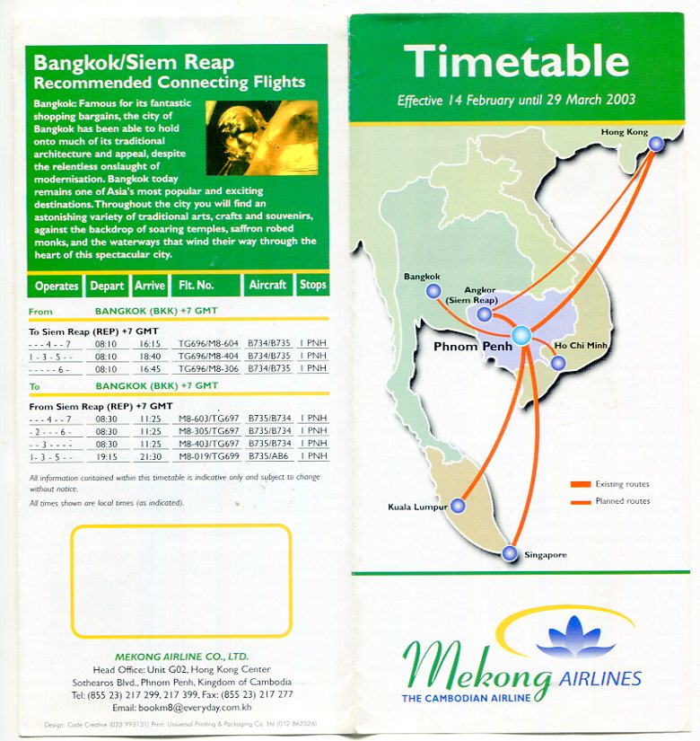 TAB17. | Mekong Airlines , A Very Scarce Mekong Airlines of Cambodia schedule dated February 14/March 29,2003, which the earlies known schedule(SAME DATE ON TIMETABLEIMAGES.COM). TT measures 4" x 8 3/8" with three panels. Founded in 1998 as Yana Airlines they changed the name to Mekong Airlines in 2002. Mekong Airlines leased a Boeing 737-500, which was put in service January 15,2003 and returned on October 16,2003, marking the end of Mekong's operations, used Schedule , Schedule | EX $20.00 |