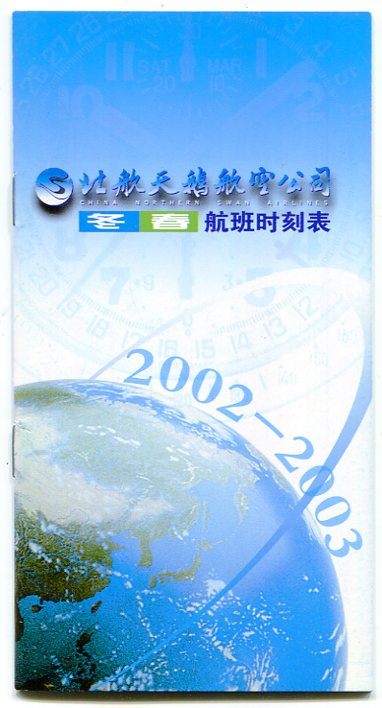 TAB18. | China Northern Swan , A Uncommon China Northern Swan airlines schedule dated 2002/2003. TT measures 3 3/4" x 7 1/8" with 14 pages. TEXT IS IN CHINESE WITH NO ENGLISH, THEREFORE I WILL NOT SCAN ANY SCHEDULES UNLESS ASKED, used | EX $4.00 |