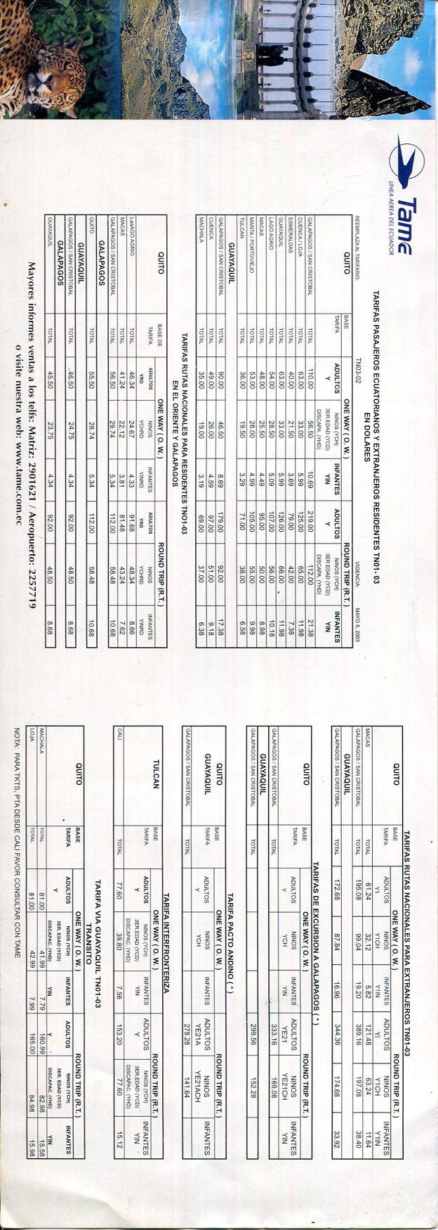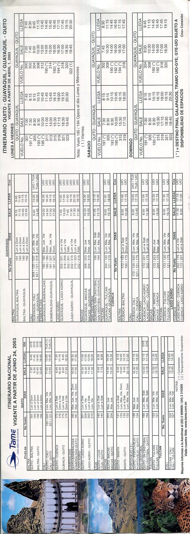 TAB19. | TAME , A TAME of Ecuador schedule dated Junio 24, 2003 (Quito-Guayaquil)/June 24, 2003 (other routes). TT measures 11 5/8" x 4 1/4", a two sided style. Has three creases in the end showing IN THE FIRS IMAGE(LFT.SIDE), used Schedule | VG $5.00 |