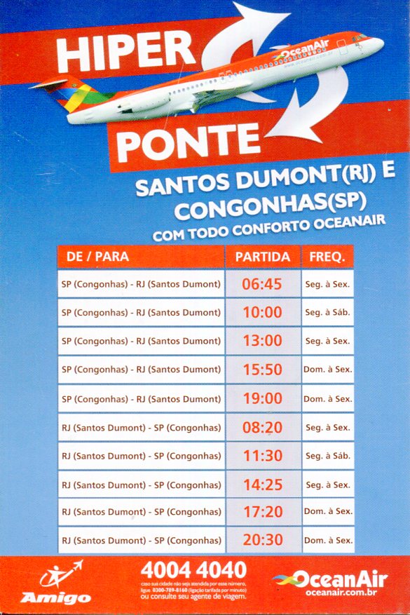 | TAB20. | OceanAir , A Uncommon OceanAir commuter schedule from Brazil, C.2010. TT measures 3 7/8" x 5 7/8", a two sided style, used Schedule | EX $5.00 |