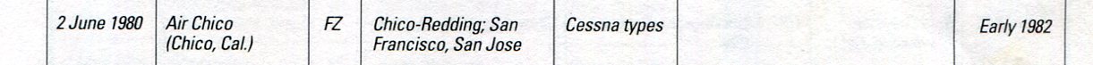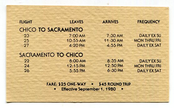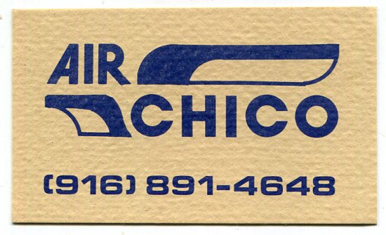 TAB21. | Air Chico , A Very Scarce Air Chico California commuter schedule dated September 1,1980. TT is a True pocket size measuring 3 1/2" x 2 1/8", a light card board two sided style, used Schedule , Air Chico Information | EX+ $20.00 |