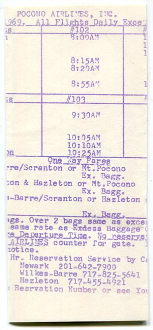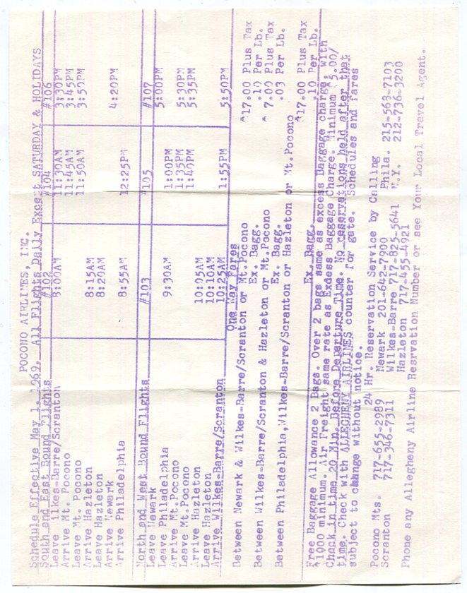 TAB22. | Pocono , A Early and Uncommon Pocono Airlines, Inc. commuter schedule dated May 1,1969. TT measures 8 1/2" x 6 5/8", and was folded for mailing(3" x 6 5/8"). Operating a Variety of aircraft, start & ceassed operational dates, ECT as SHOWN IN INFORMATION, used Schedule , Pocono Information | EX $12.00 |